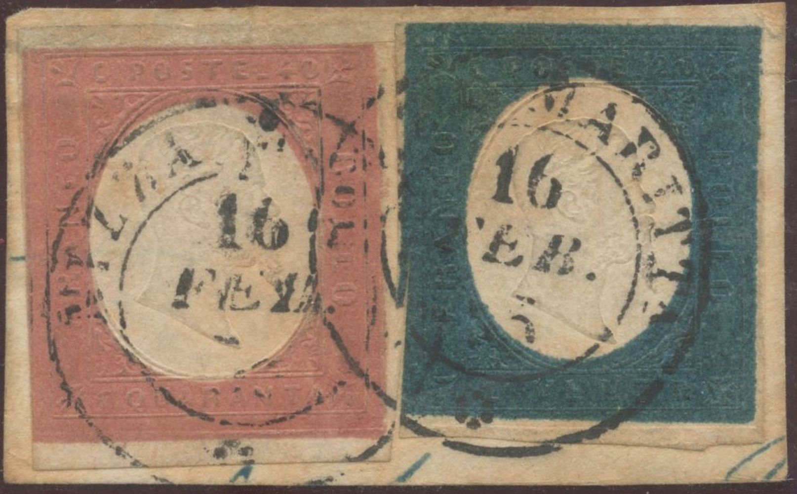 16.02.1855 - Frammento con 20c. N.8d Azzurro Verdastro e 40c. N.9 Rosso Mattone. (B) (A.Diena)