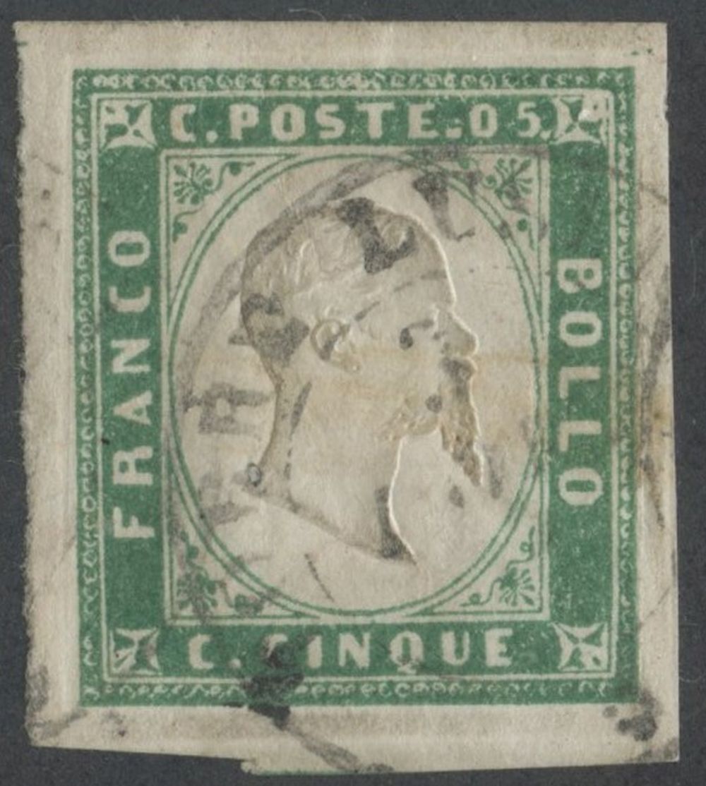 1856, 5 cent. verde smeraldo giallastro usato a Torre Luserna. Ottimo esemplare con margini enormi. (A+) (Bolaffi)