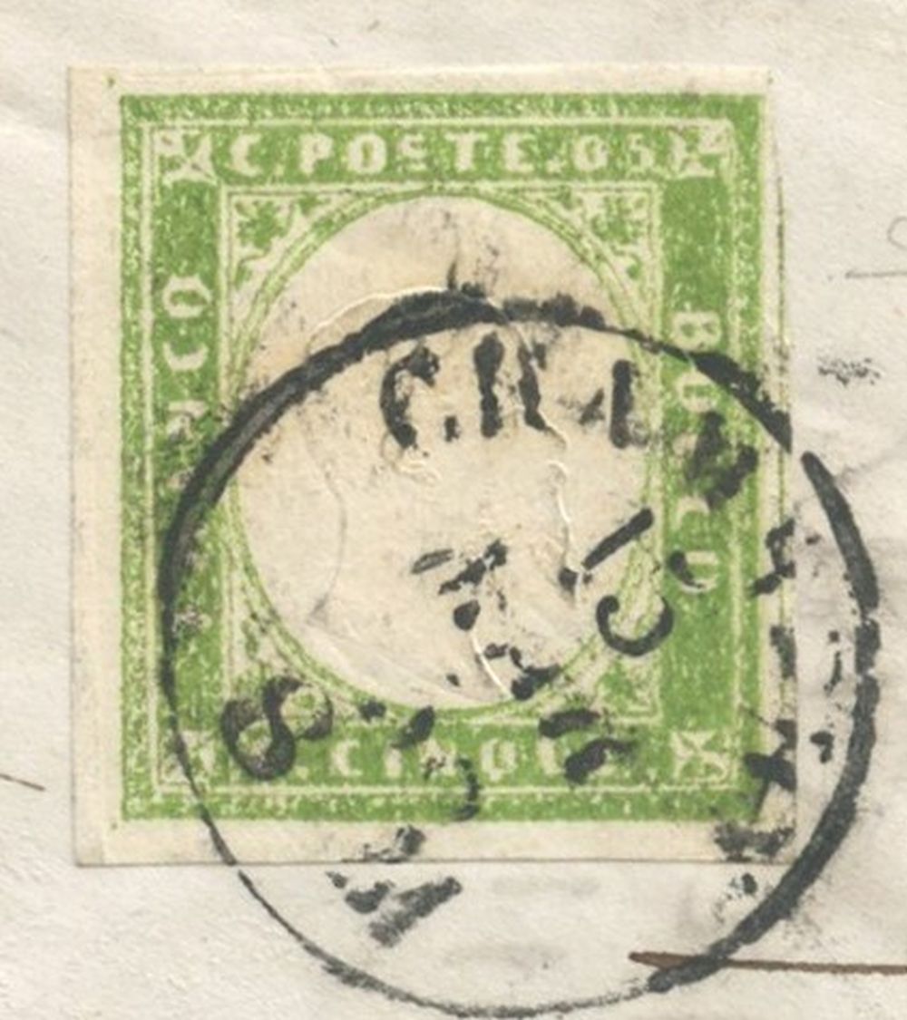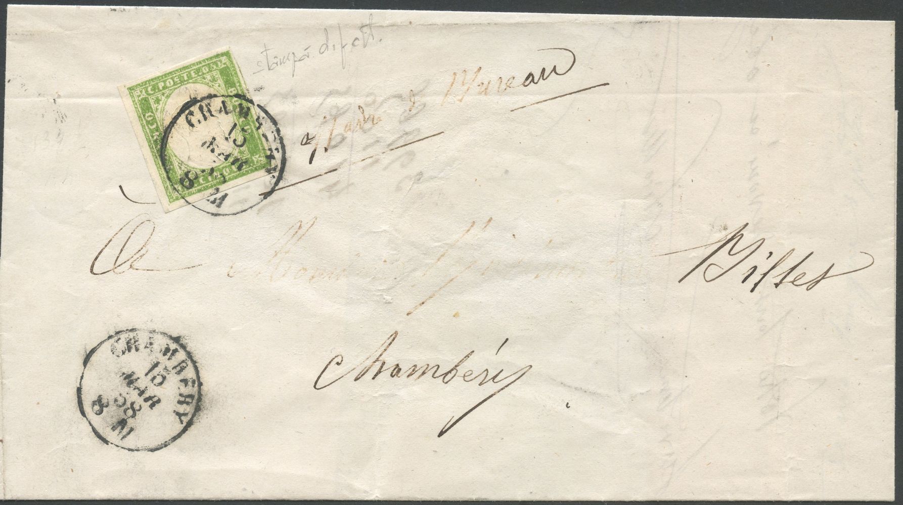 15.03.1858 - Lettera da Chambery per città affrancata tramite un 5 cent. verde giallo stampa difettosa n.13Ah. (A+)
