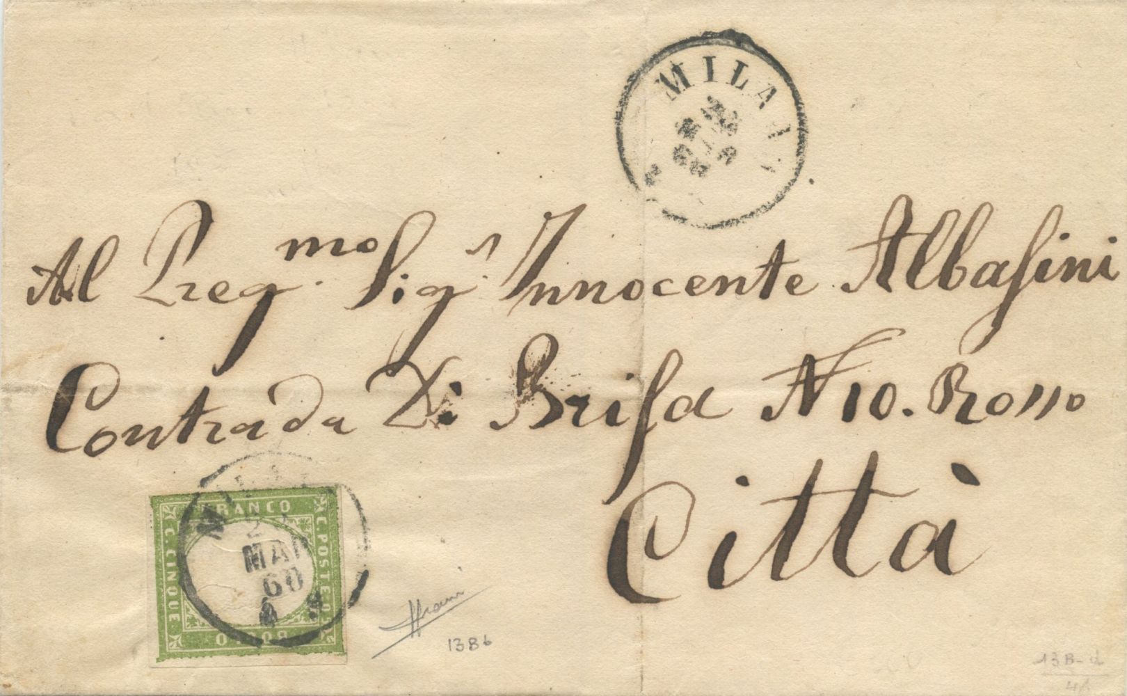 22.03.1860 - Lettera spedita da Milano per città affrancata in tariffa di primo porto per lettere spedite all'interno del comune tramite un valore da 5 cent. verde oliva chiaro n.13Bb.