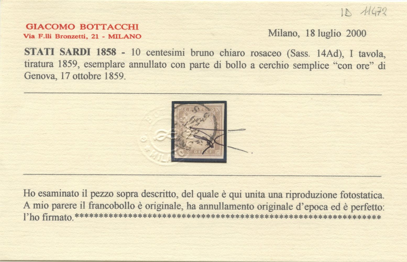 1859 - 10 cent. nella rara tonalità ''Cenere Grigio Seppia'' classificato dal sassone n.14Ad ed usato a Genova il 17 OTT 1859 (Località e periodo tipici per questa tonalità). (A) (Cert. Bottacchi)