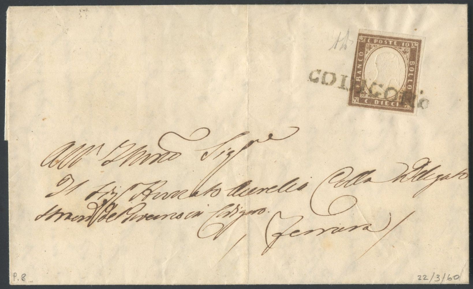 23.03.1860 - Lettera da Codigoro per Ferrara affrancata tramite un 10 cent. bruno lillaceo n.14Ba. Sull'affrancatura lo SI di CODIGORO (8pt.) (A-) (Alberto Diena)