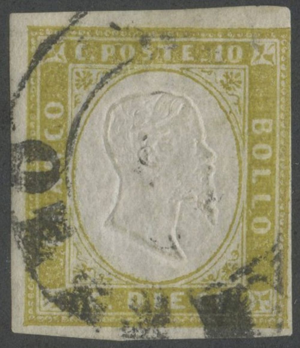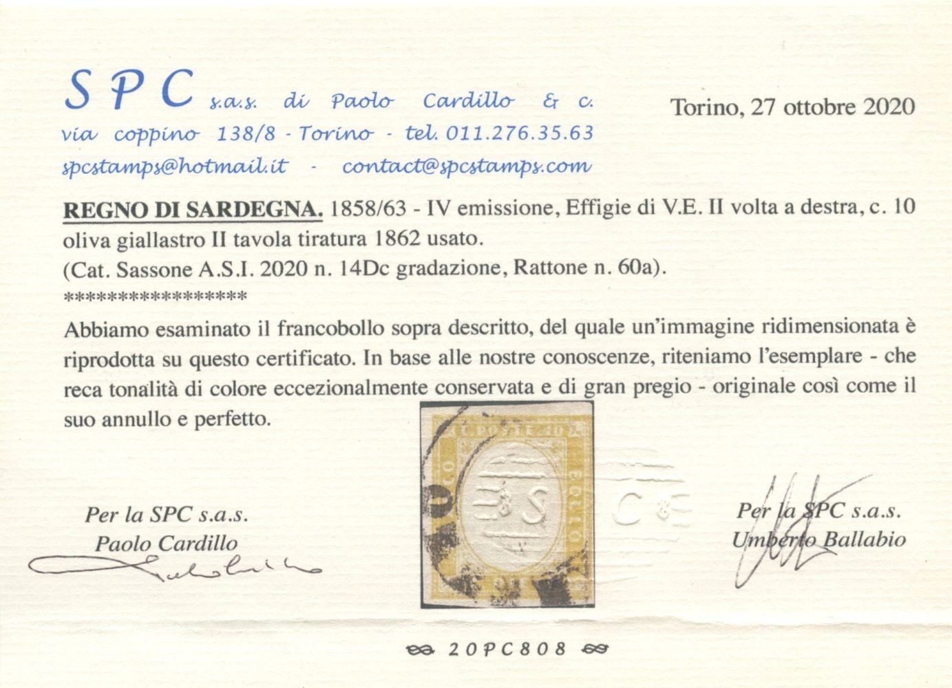 1862 - 10 cent. giallo olivastro n.14Dc nella sua tonalità più rara. A filo a destra ma cornice non intaccata. (A) (Cert. Cardillo)
