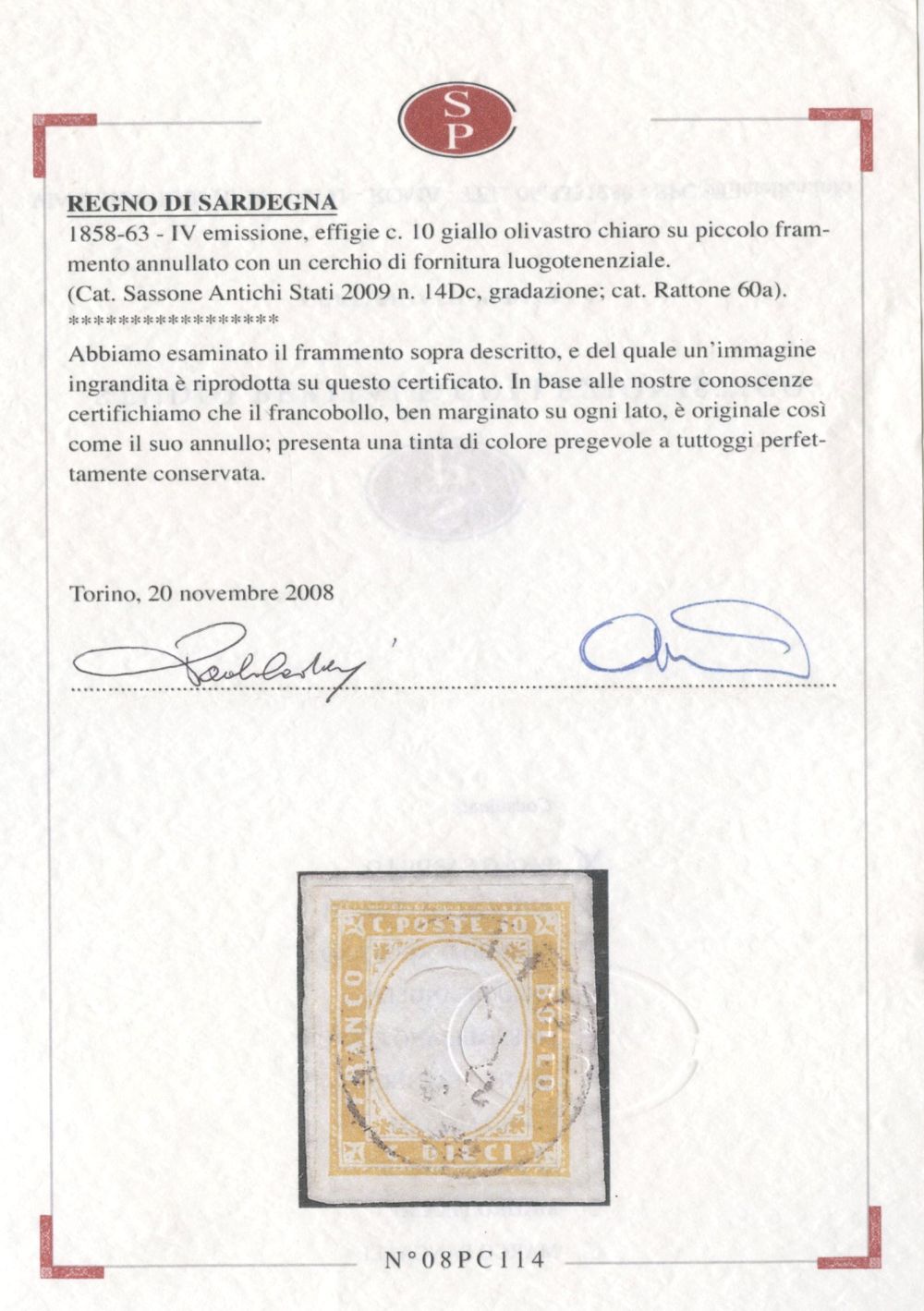 1862 - 10 cent. Giallo Olivastro (Nella nuance classificata dal Rattone come Ocra Olivastro) usato su piccolo frammento. (A) (Cert. Cardillo, Biondi)