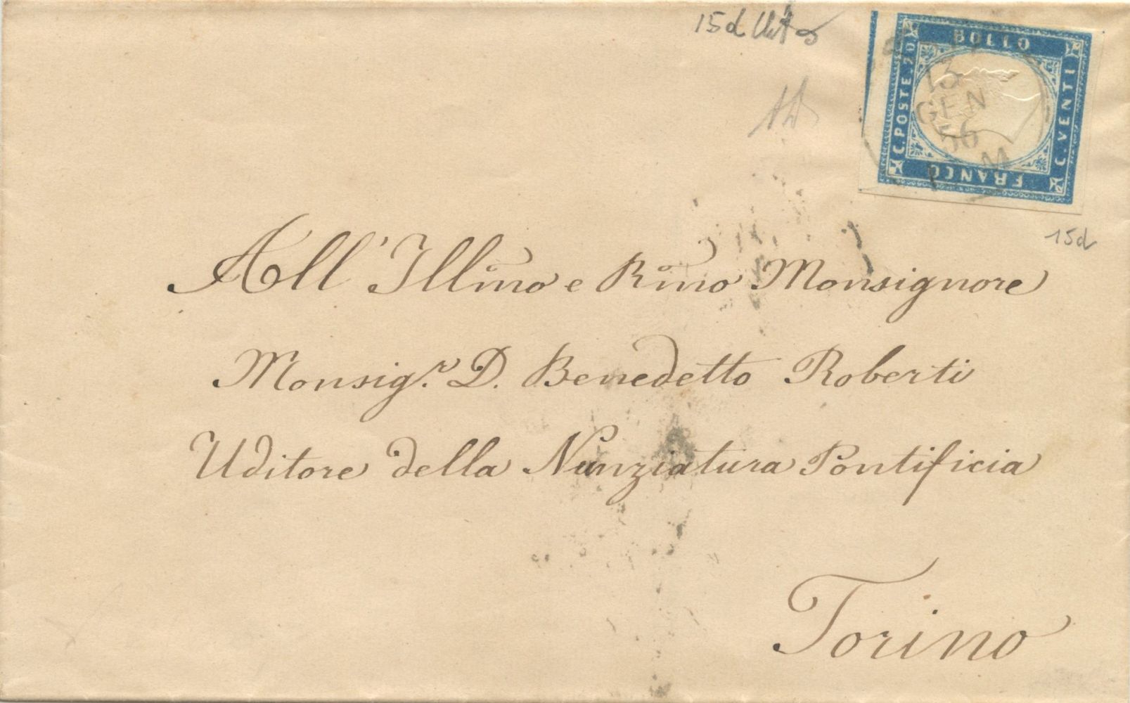 13.01.1856 lettera affrancata per 20 centesimi tramite un 20 cent. cobalto latteo vivace n.15d. (A-) (Alberto Diena, Ballabio)