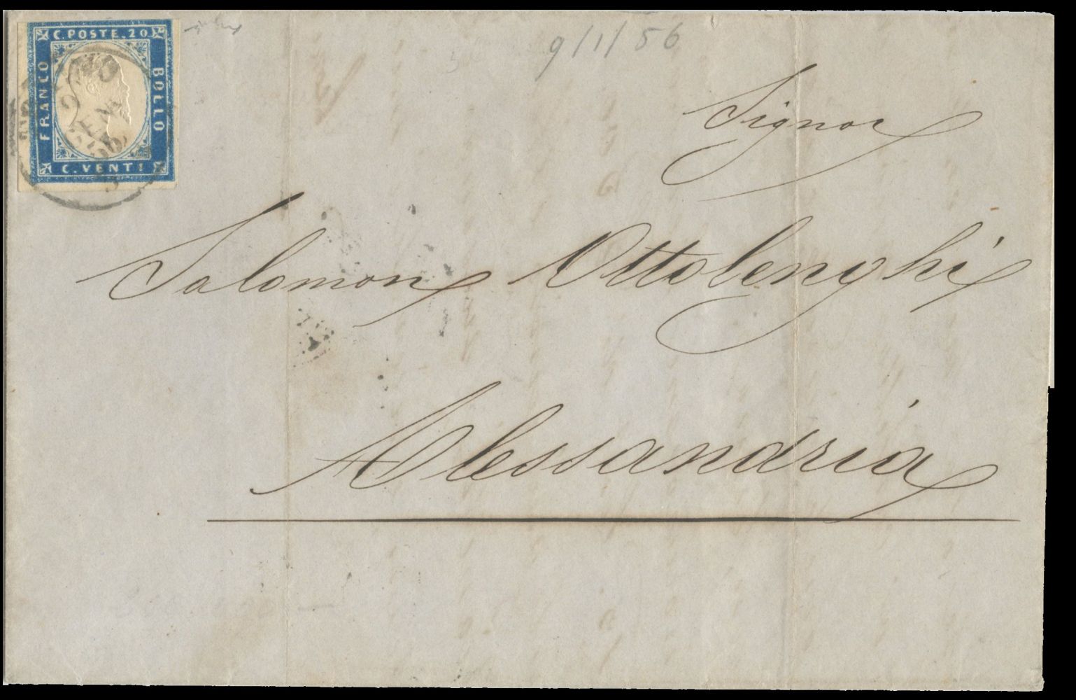 09.01.1856 - lettera da Torino per Alessandria affrancata tramite un 20 cent. celeste vivace n.15h a filo/sfiorato in alto. (A-) (Chiavarello)