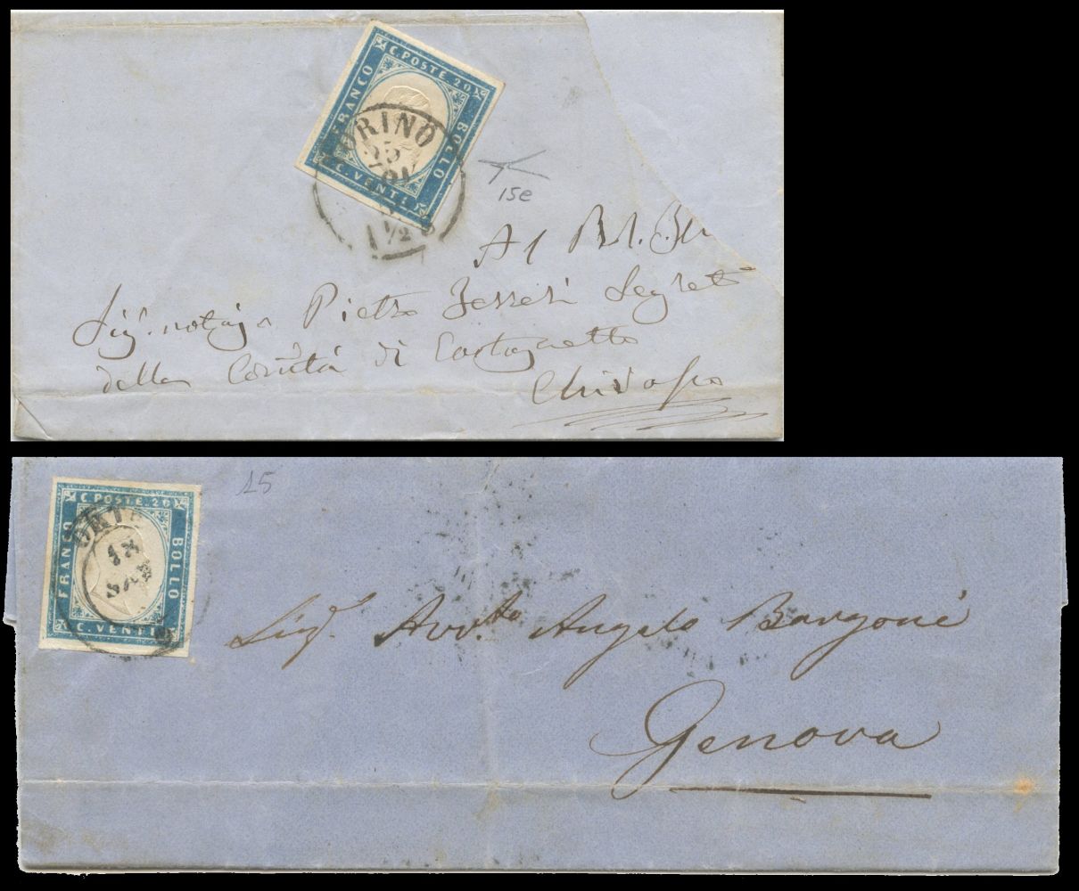 1856, due lettere affrancate tramite un 20 cent. (15a, 15e Bottacchi). interessante insieme. (A+) Ex Coll. Castelli.