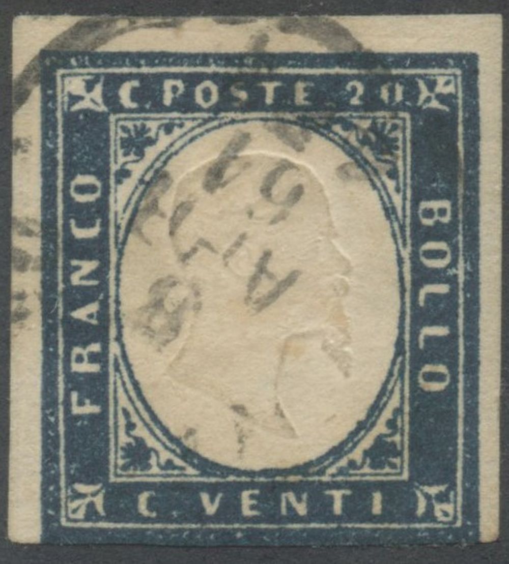 1861, 20 cent cobalto oltremare scuro n.15Di. Tre ottimi margini ma toccato in basso. (B) (Ballabio) Ex Coll. Castelli.