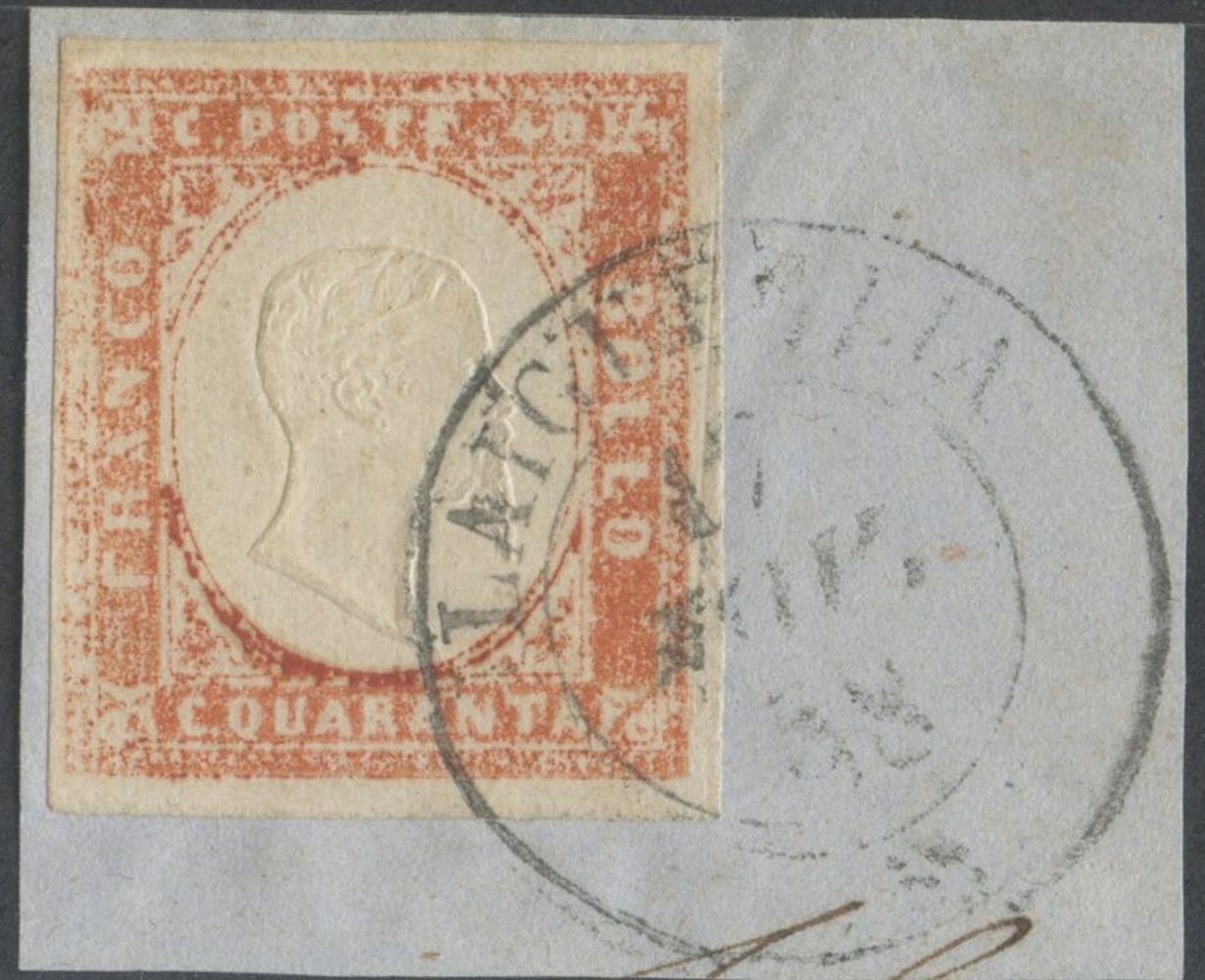 1858 - 40 cent. vermiglio arancio chiaro n.16Ab conservato su piccolo frammento. (A+)