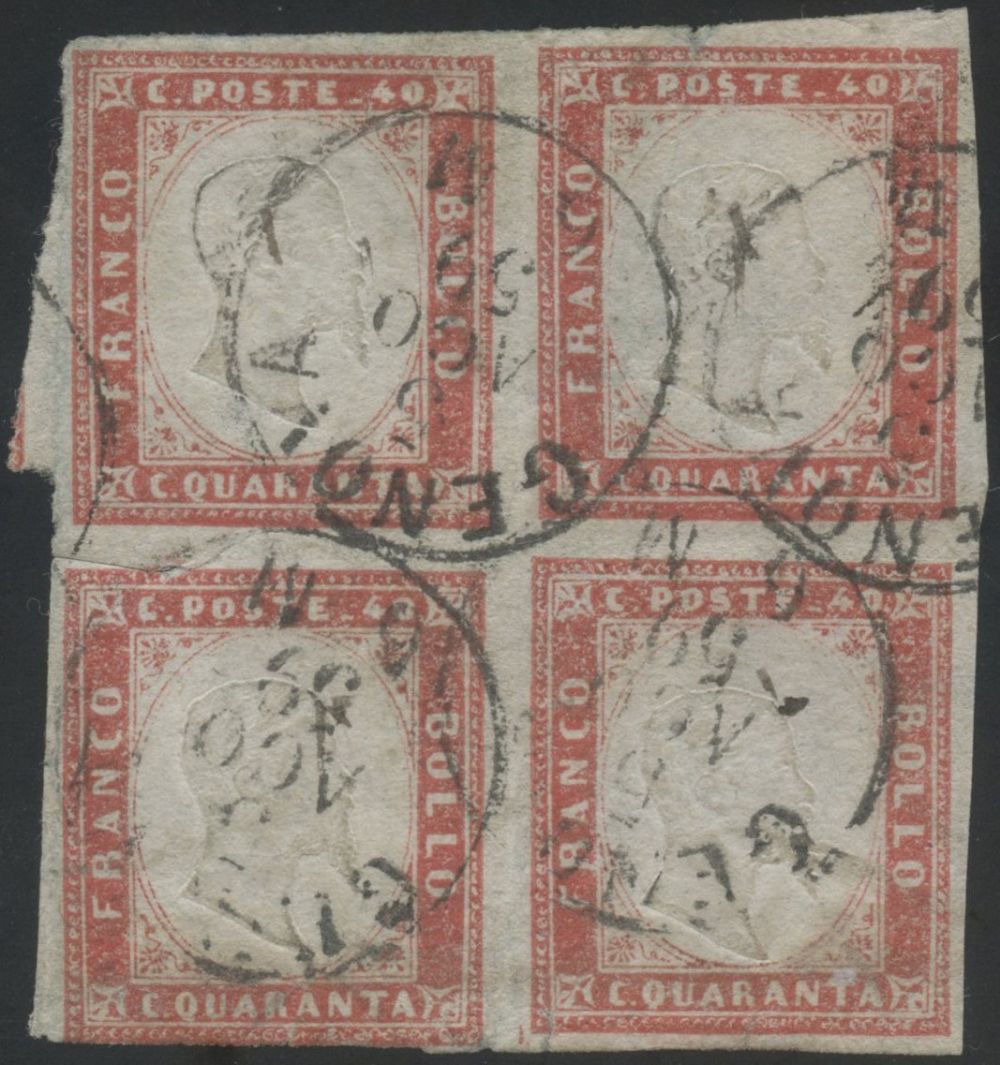 1857 - 40 cent. rosso scarlatto chiaro n.16Aa in quartina usata a Genova il 05.08.1857. Alcuni difetti ma oggetto non comune. (B) (Cert. Bottacchi)