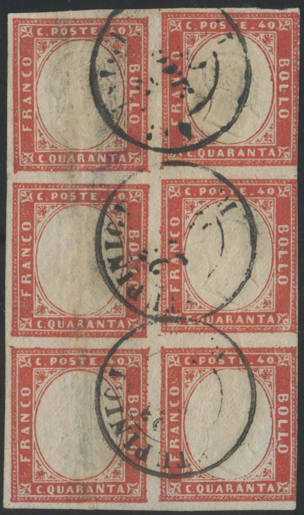 1861 - 40 cent. rosso carminio n.16Da in blocco di 6 usato a Stupinigi (12pt.). Insieme molto raro con alcuni difetti. (B) (Attestato P.Gazzera)
