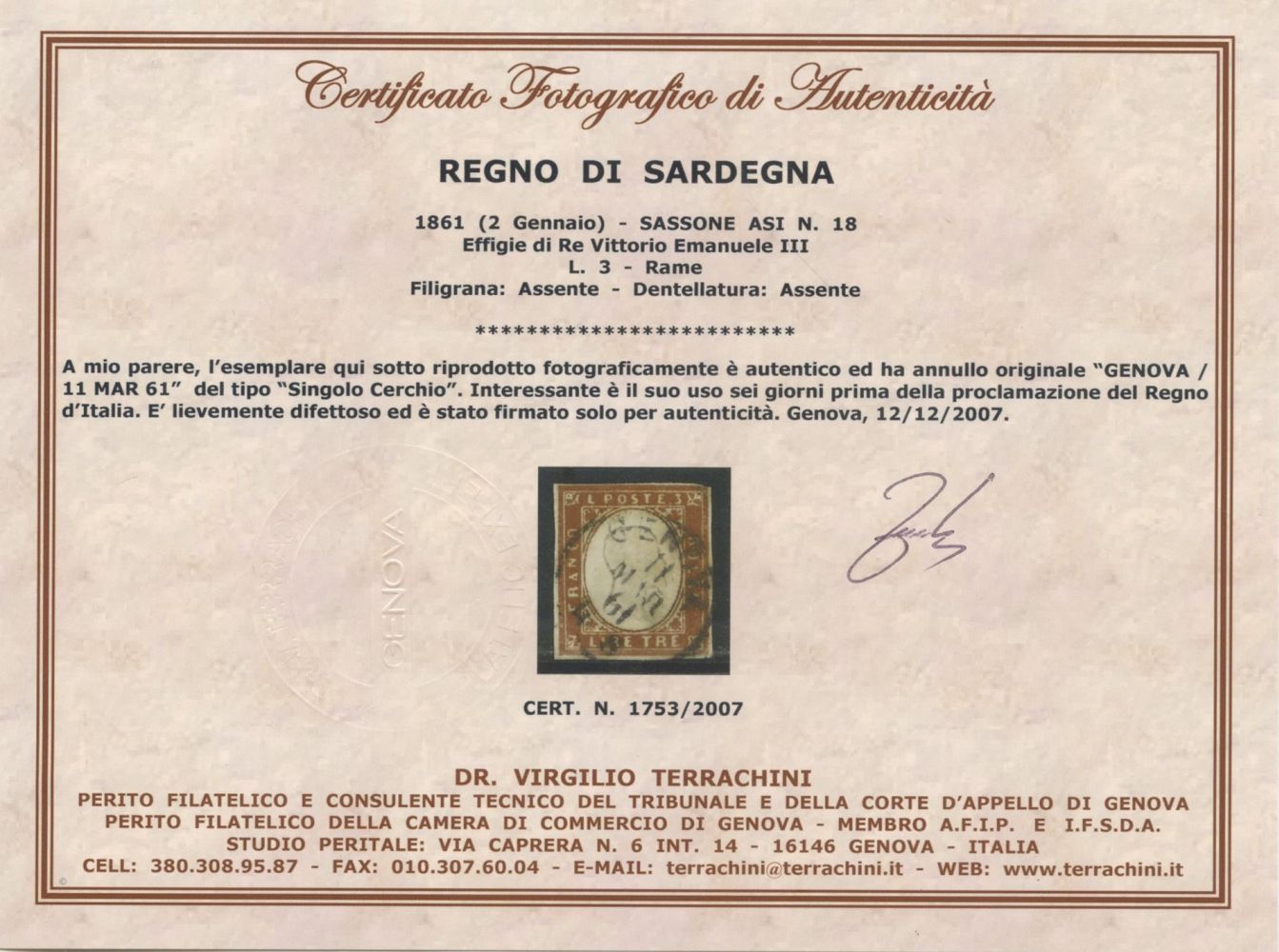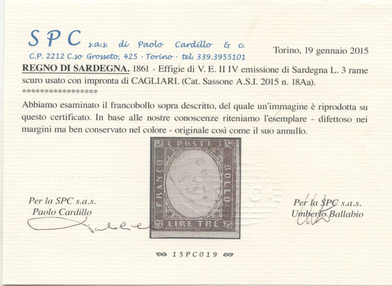 1861 - 3 Lire nelle tre tonalità classificate n.18, 18A e 18Aa, usati con nitidi annulli originali e certificati. Insieme non comune. (B) (Bottacchi, Cardillo e Terrachini)