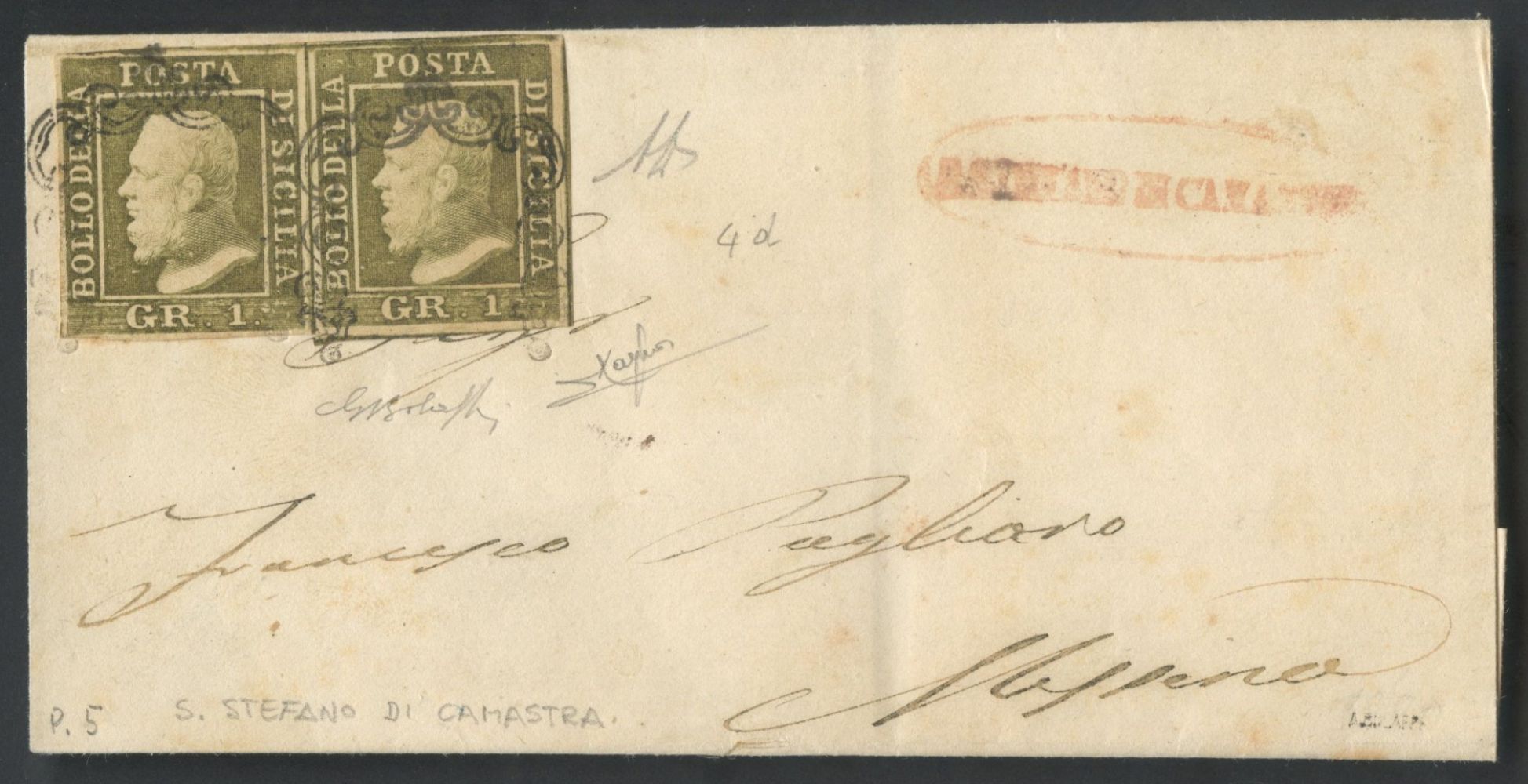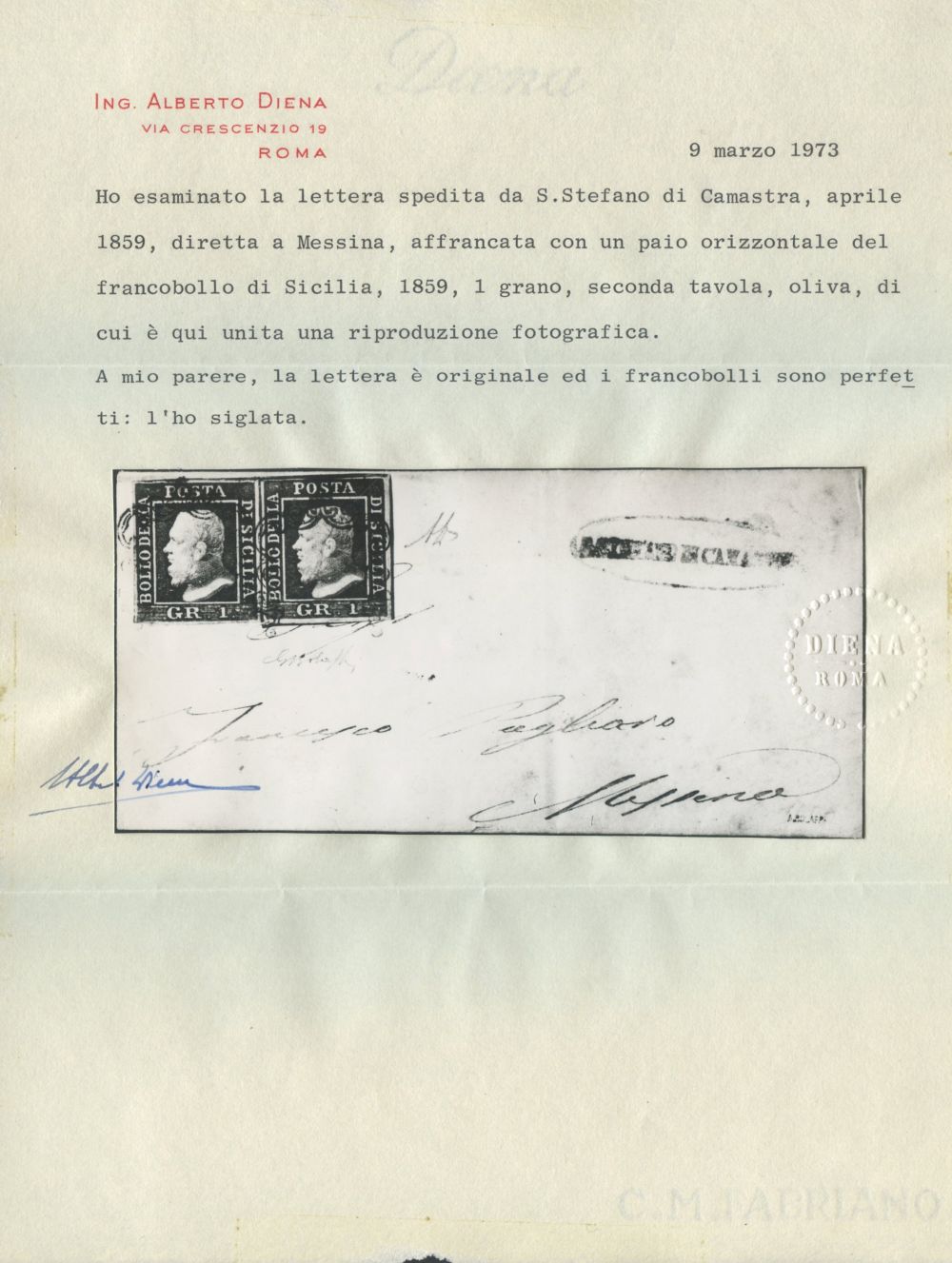 1859 - Busta spedita da S. Stefano di Camastra per Messina affrancata tramite una coppia dell' 1gr. oliva n.4d. Sulla busta l'ovale in rosso di S. STEFANO DI CAMASTRA (5pt.). Raro e splendido insieme. (A+) (Cert. storico Alberto Diena, Bolaffi per esteso, Raybaudi)