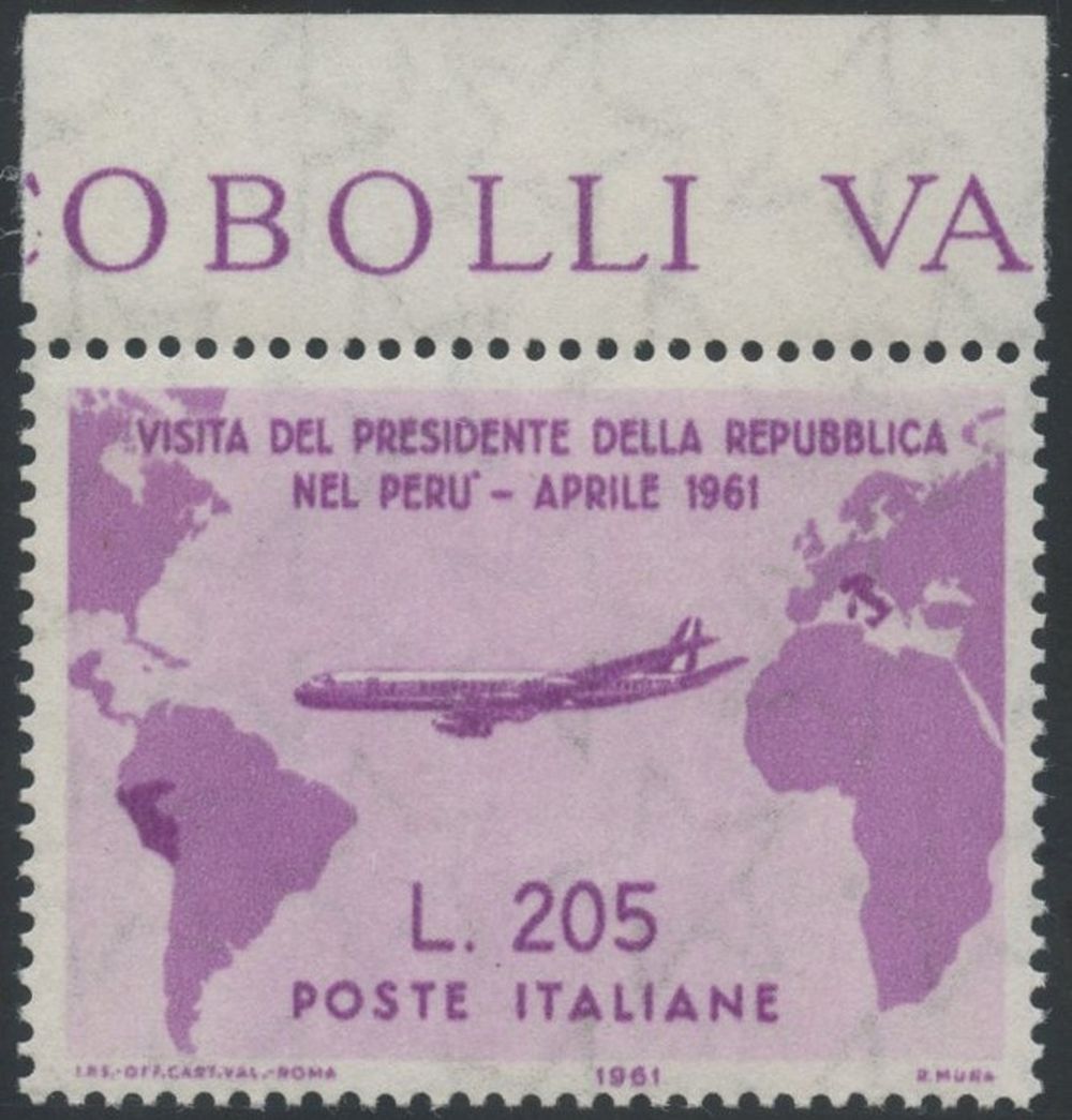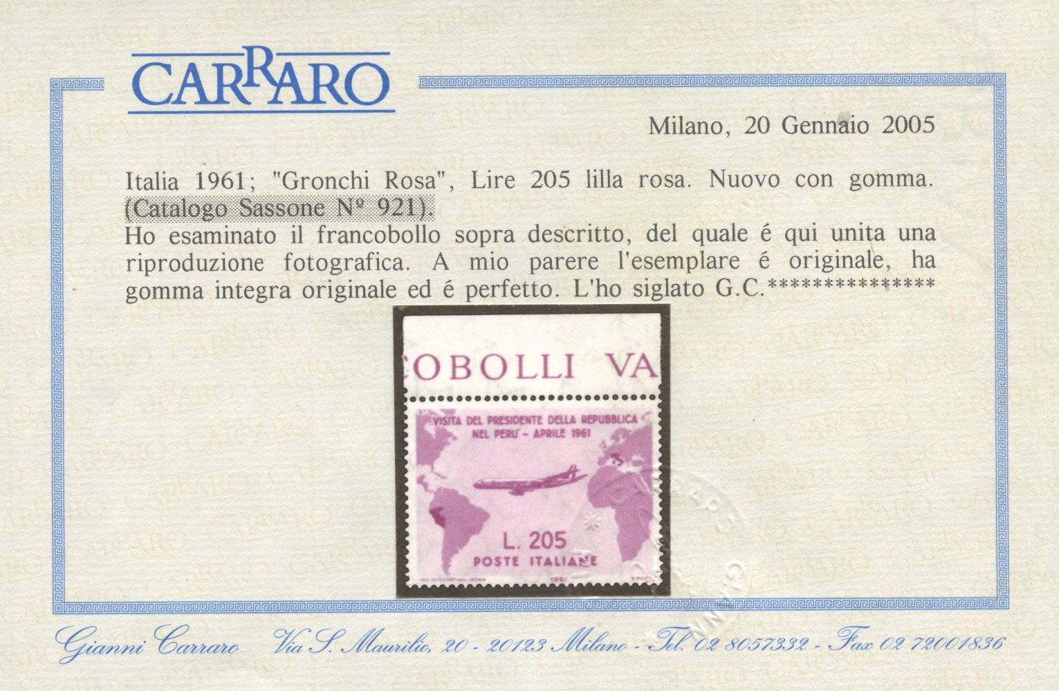 1961, Gronchi Rosa 205L n. 921. Splendido esemplare con bordo di foglio in alto, nuovo con gomma integra. Certificato Carraro.