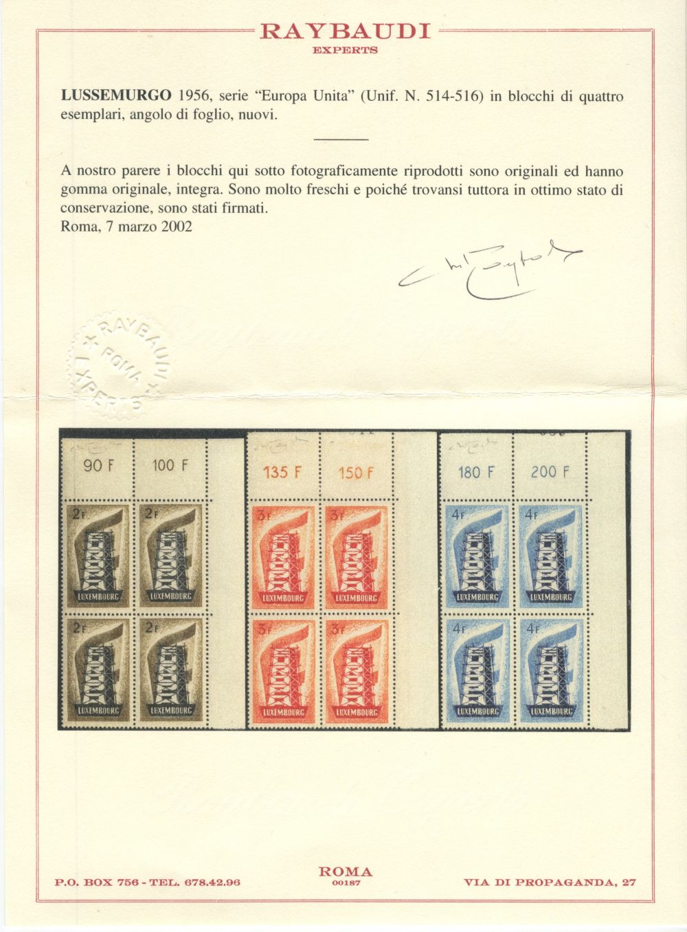 1956, N.514/516 in splendide quartine angolo di foglio nuove. Certificato Raybaudi.