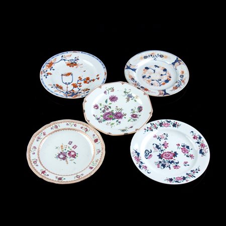 Lotto 25 | CINQUE PIATTI IN PORCELLANA CON DECORO A SMALTI POLICROMI