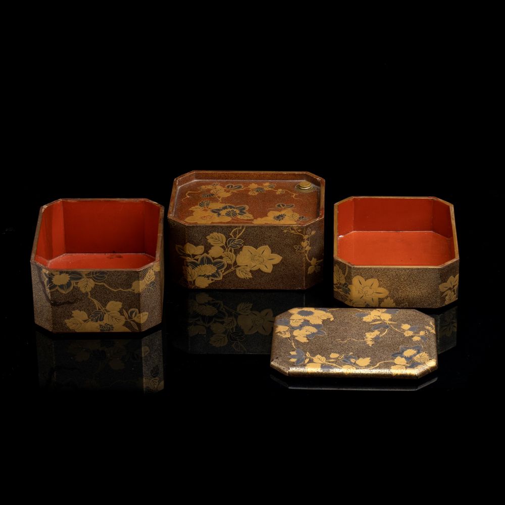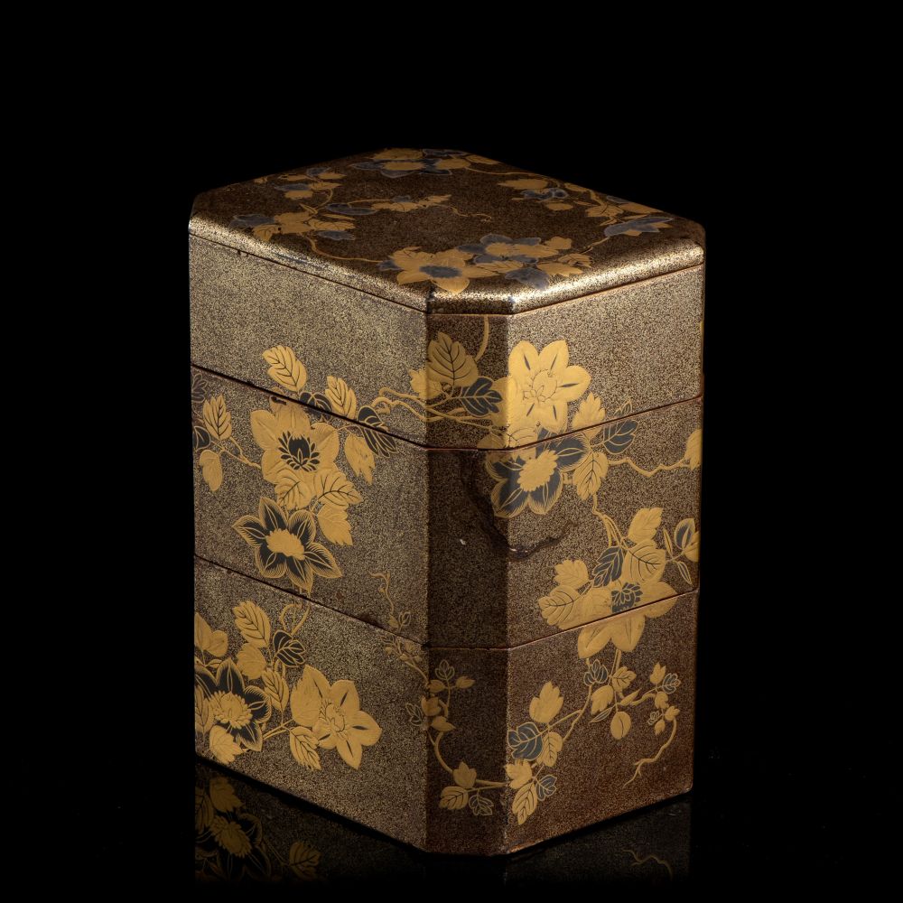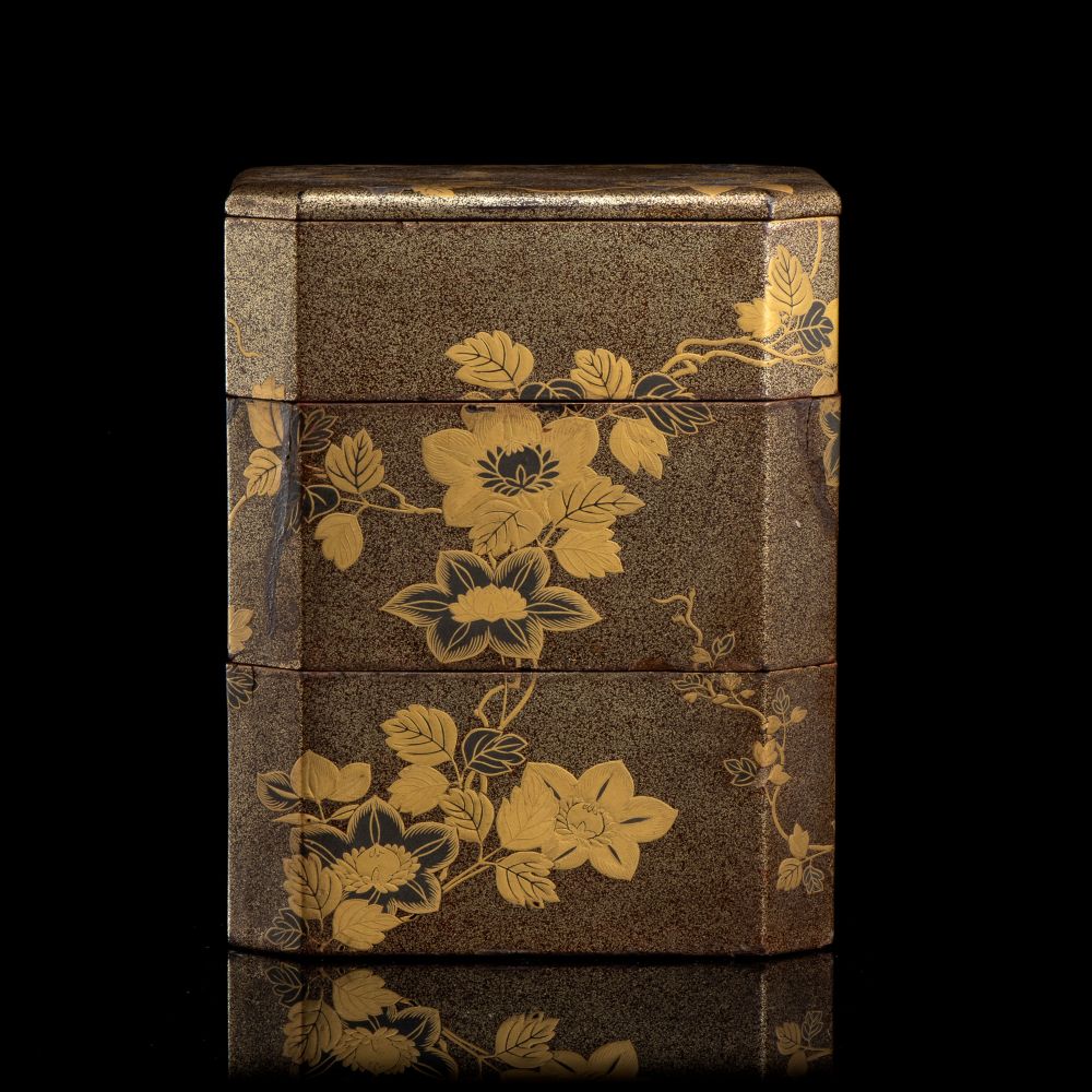 PORTAVIVANDE A TRE SCOMPARTI IN LEGNO LACCATO E DORATO, SAGEJUBAKO