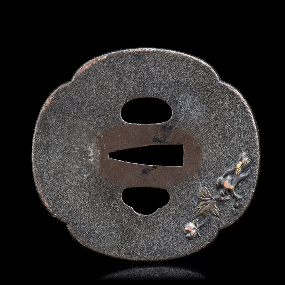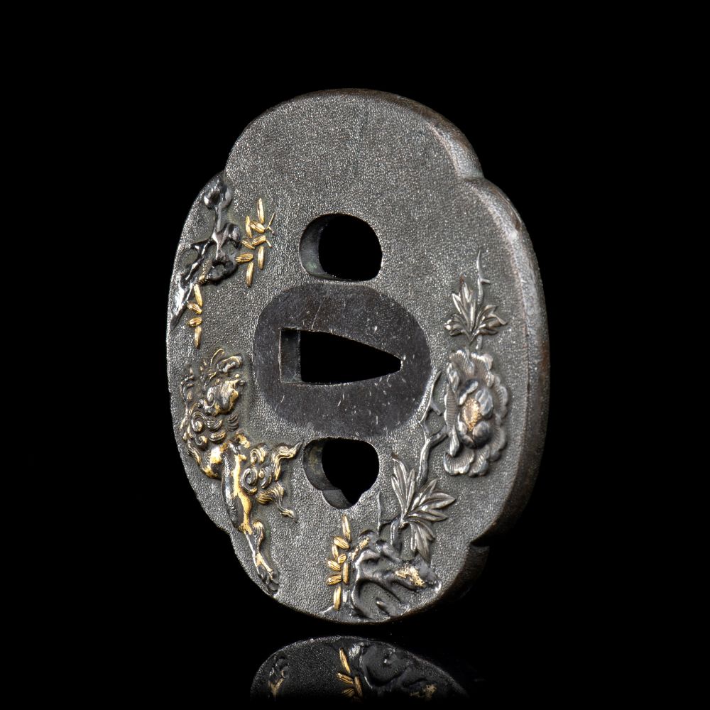 TSUBA IN FERRO PARZIALMENTE DORATO CON SHISHI E PEONIE