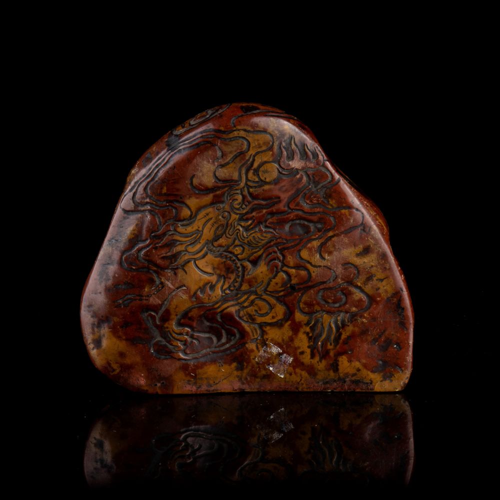 Su un lato una lunga iscrizione, sull'altro un drago.