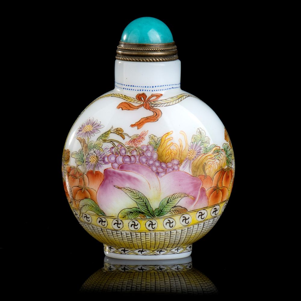 SNUFF BOTTLE IN VETRO CON DECORO A SMALTI POLICROMI