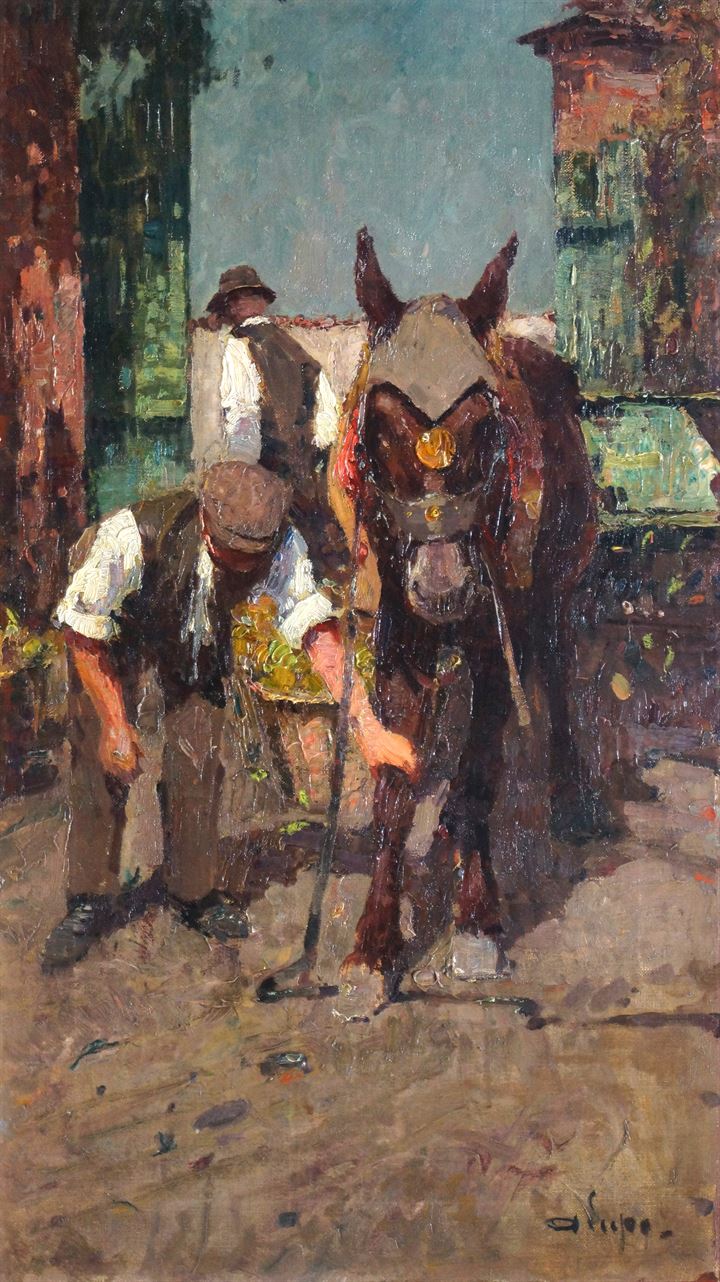 LUPO ALESSANDRO Torino 1876 - 1953 "Al mercato: contadino con cavallo" 70x40...