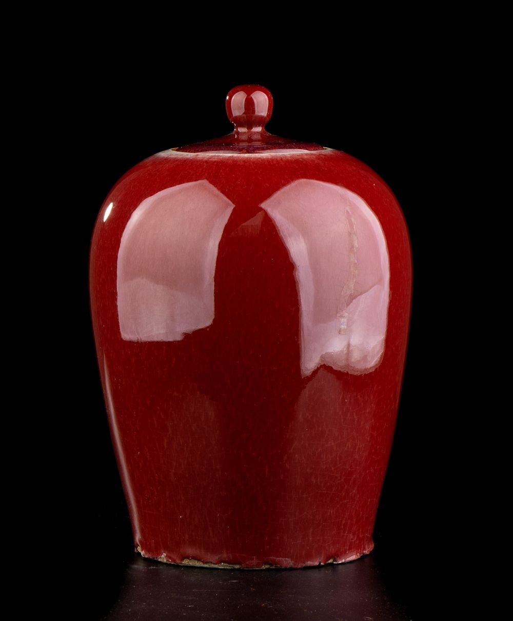 GIARA CON COPERCHIO IN PORCELLANA CON INVETRIATURA 'SANGUE DI BUE'