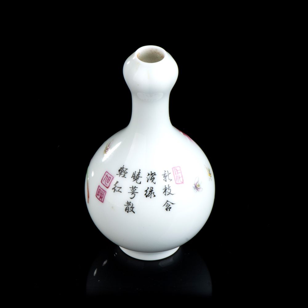 Decorato con una composizione floreale e iscrizione, marchio apocrifo di Yongzheng al centro della base.