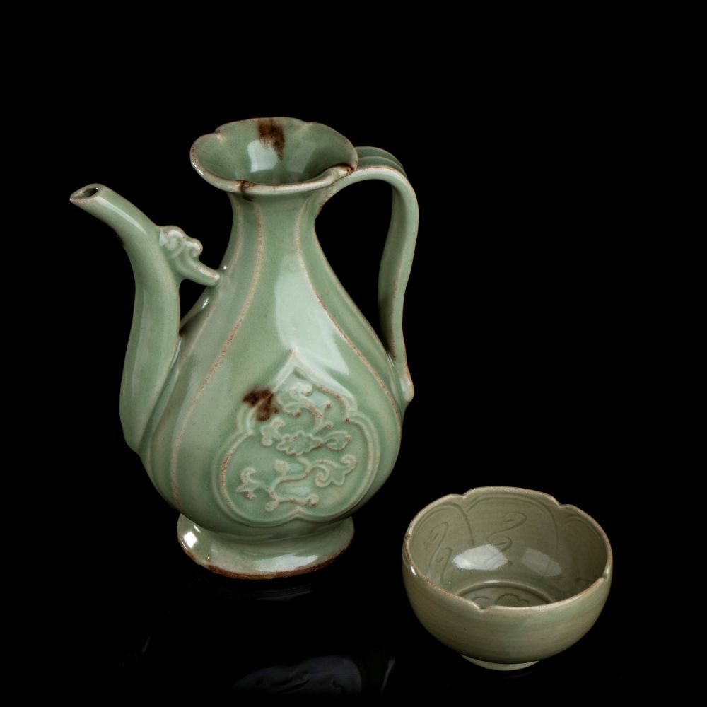 UNA CIOTOLA E UN VERSATOIO IN CERAMICA CON INVETRIATURA CÉLADON XX secolo 19 x 15 x 8
