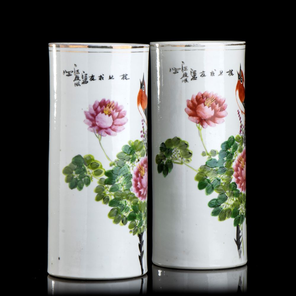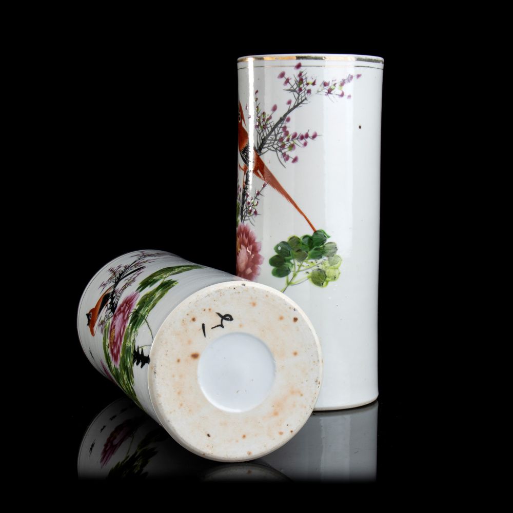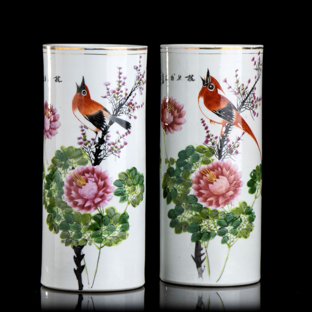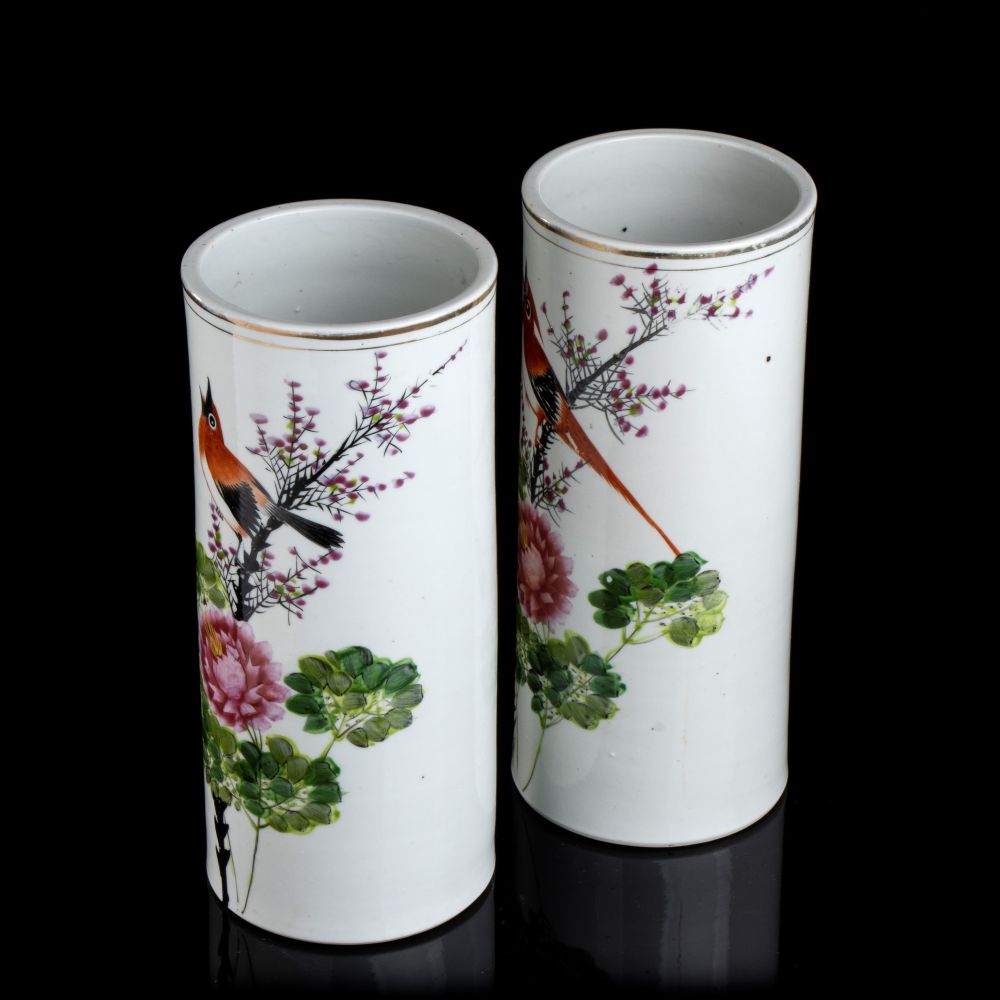 Lotto 237 | COPPIA DI VASI CILINDRICI IN PORCELLANA CON DECORO A SMALTI POLICROMI XX secolo 27,5 x 12 cm