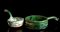 Entrambi a sezione circolare, hanno lunga presa con finale a testa di drago, rivestiti sull'esterno di invetriatura verde a eccezione della base, da prototipi in metallo.