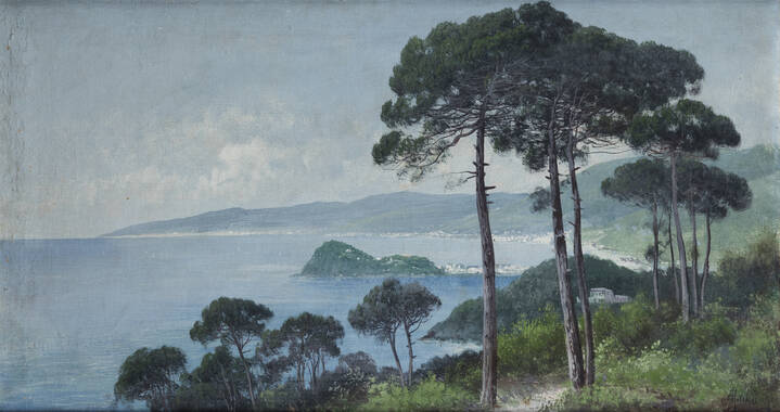 HENRY MARKO'<BR>Firenze 1855 - 1921 Lavagna (GE)<BR>"Scorcio di mare con pini"