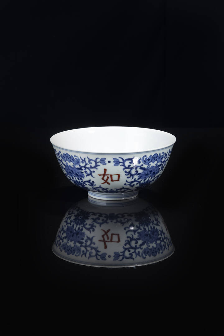 Ciotola in porcellana bianco e blu con decori floreali e iscrizioni, Cina, Repubblica, XX sec