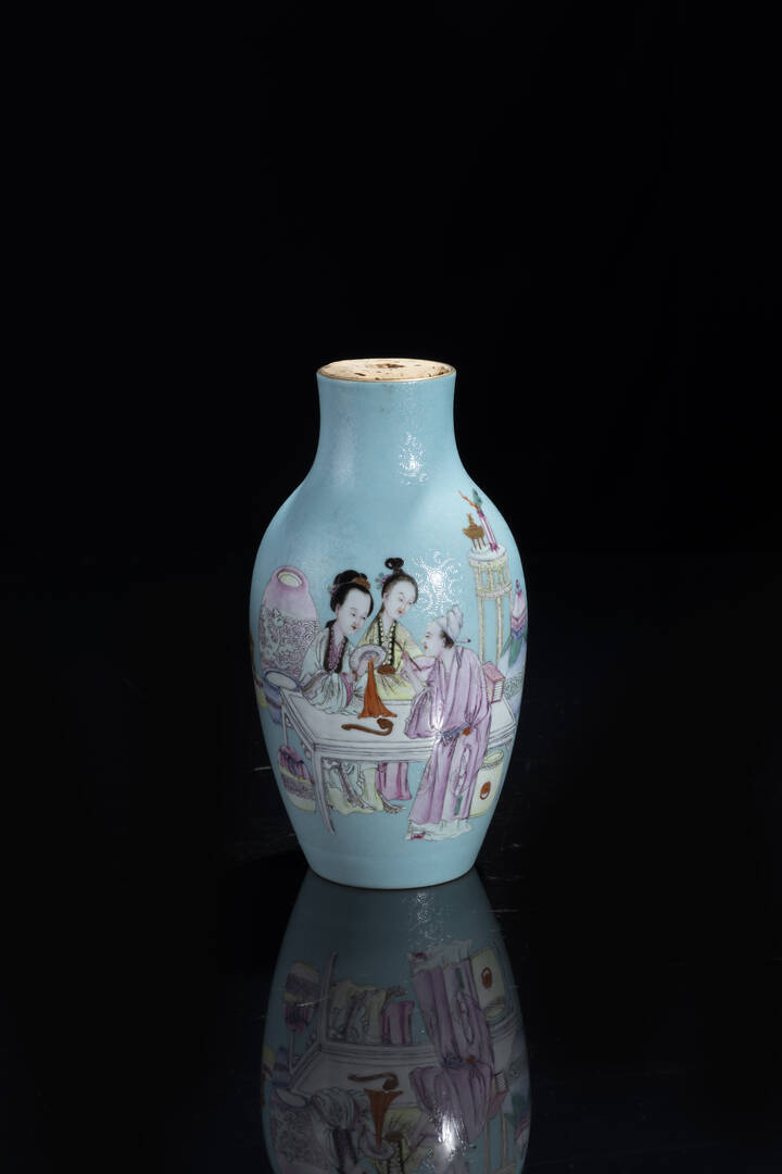 Vaso in porcellana Famiglia Rosa con decori di personaggi su fondo turchese, Cina, Repubblica XX sec