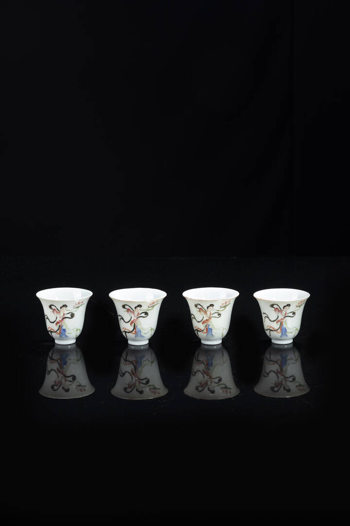 Lotto composto da quattro tazzine in porcellana Famiglia Rosa, con decoro di personaggi, Cina, dinastia Qing, epoca Daoguang (1821-1850)