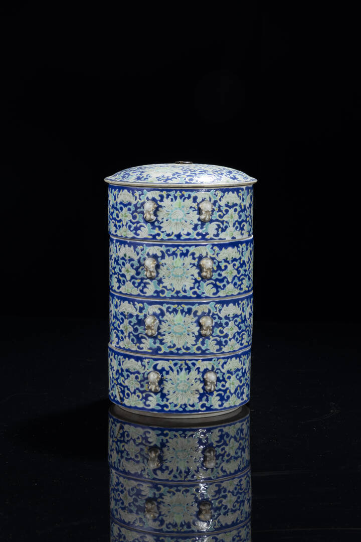 Vivandiera in porcellana con decori floreali su fondo blu, Cina, dinastia Qing, XIX sec