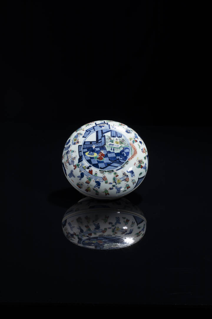 Scatola in porcellana Wucai decorata con scene di corte e personaggi, Cina, dinastia Qing, XIX sec