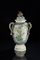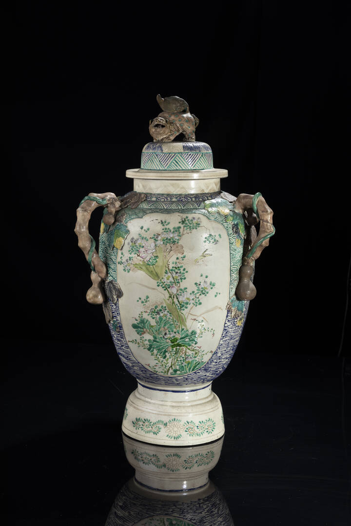 Vaso in ceramica con tappo sormontato da cane di Pho con decori di personaggi e giardini entro riserve, manici a forma di ramo, Giappone, XIX sec