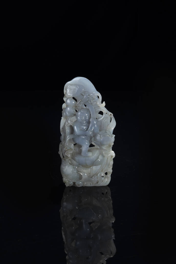 Gruppo in giada celadon intarsiato con ragazzo, Cina, Repubblica, XX sec