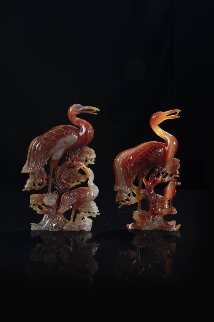 Coppia di fenici finemente scolpite in agata, Cina, Repubblica, XX sec