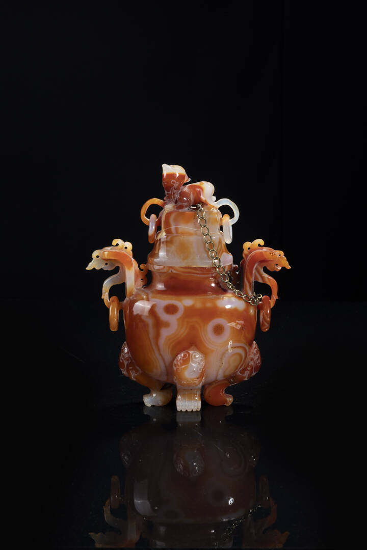 Vaso in agata con manici e coperchio sormontato da animale, Cina, Repubblica, XX sec