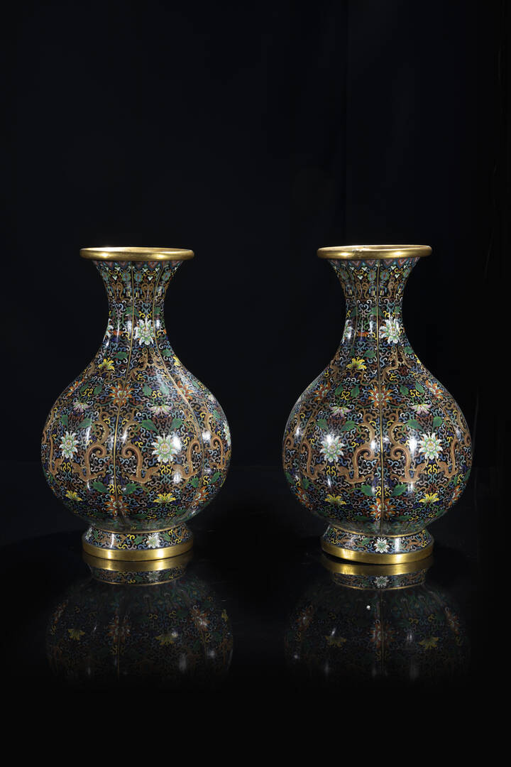 Coppia di vasi a bottiglia in smalto con decori di fiori di loto su sfondo nero, Cina, dinastia Qing, epoca Guanxu (1875-1908)