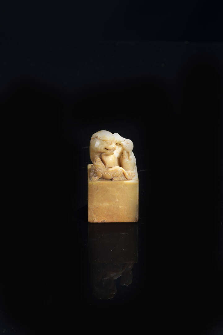 Sigillo in saponaria sormontato da cani di Pho, Cina, dinastia Qing, XIX sec
