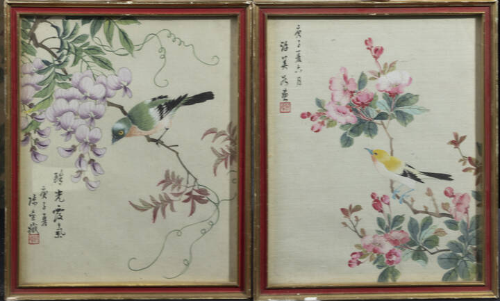 Coppia di quadretti dipinti su pergamena raffiguranti uccelli su rami, Cina, Repubblica, XX sec