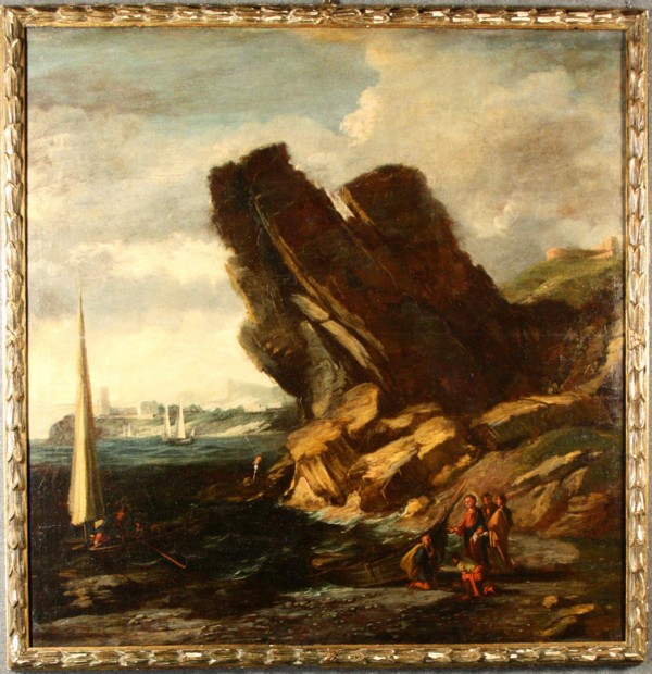 Firmato, datato. Antico dipinto olio su tela raff. ''PAESAGGIO MARINO CON LA CHIATTA DI PIETRO E ANDREA''. In bella cornice in legno intagliato e laccato. XVIII secolo. Restauri. Mis. Lung. cm. 144 Alt. cm. 148 ca.