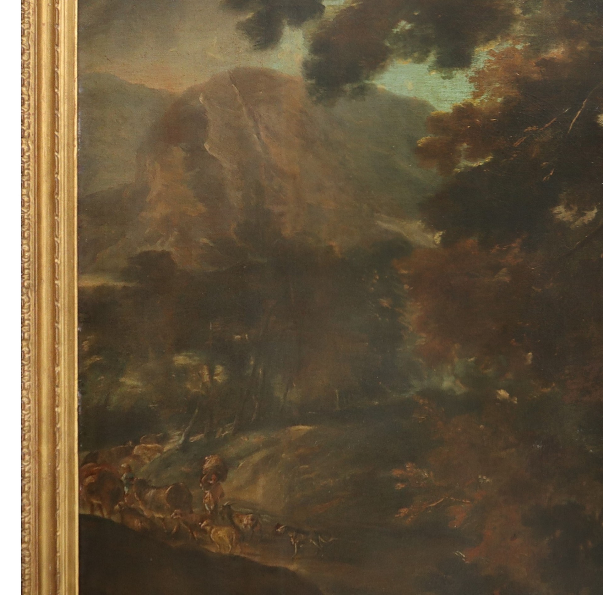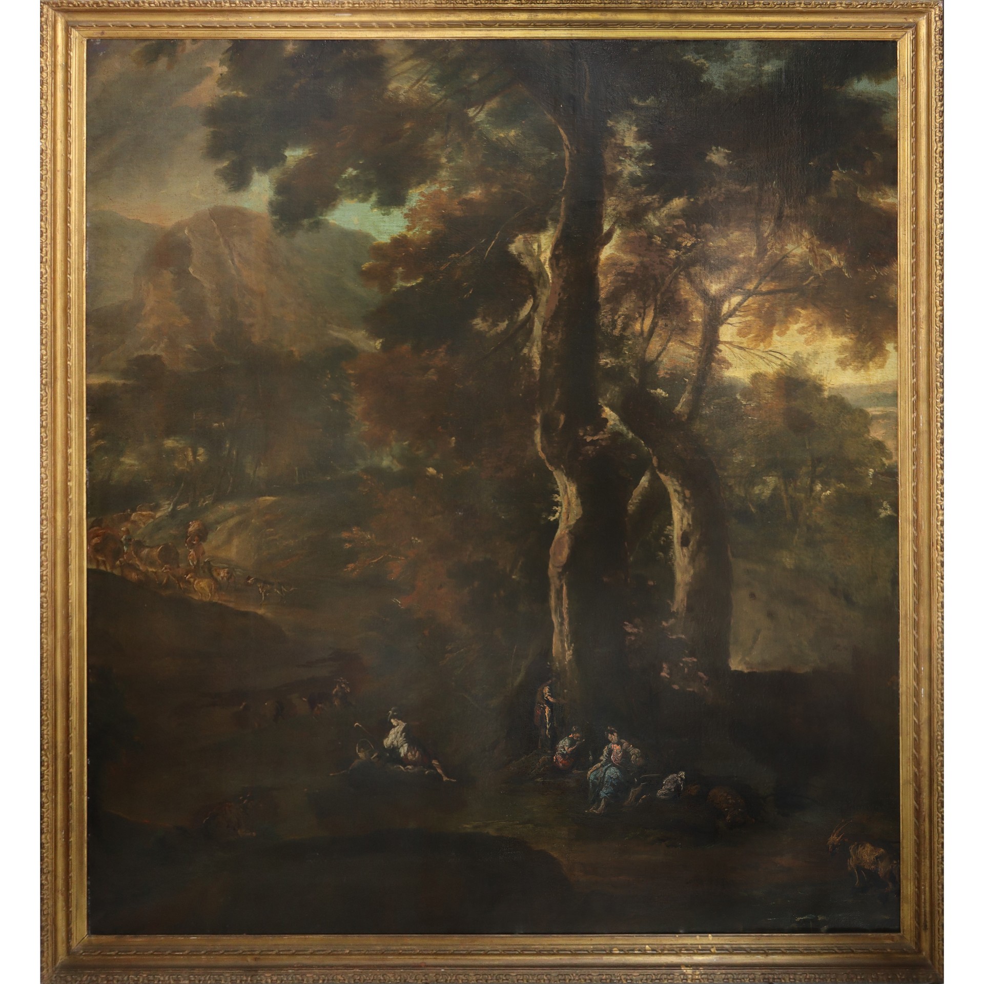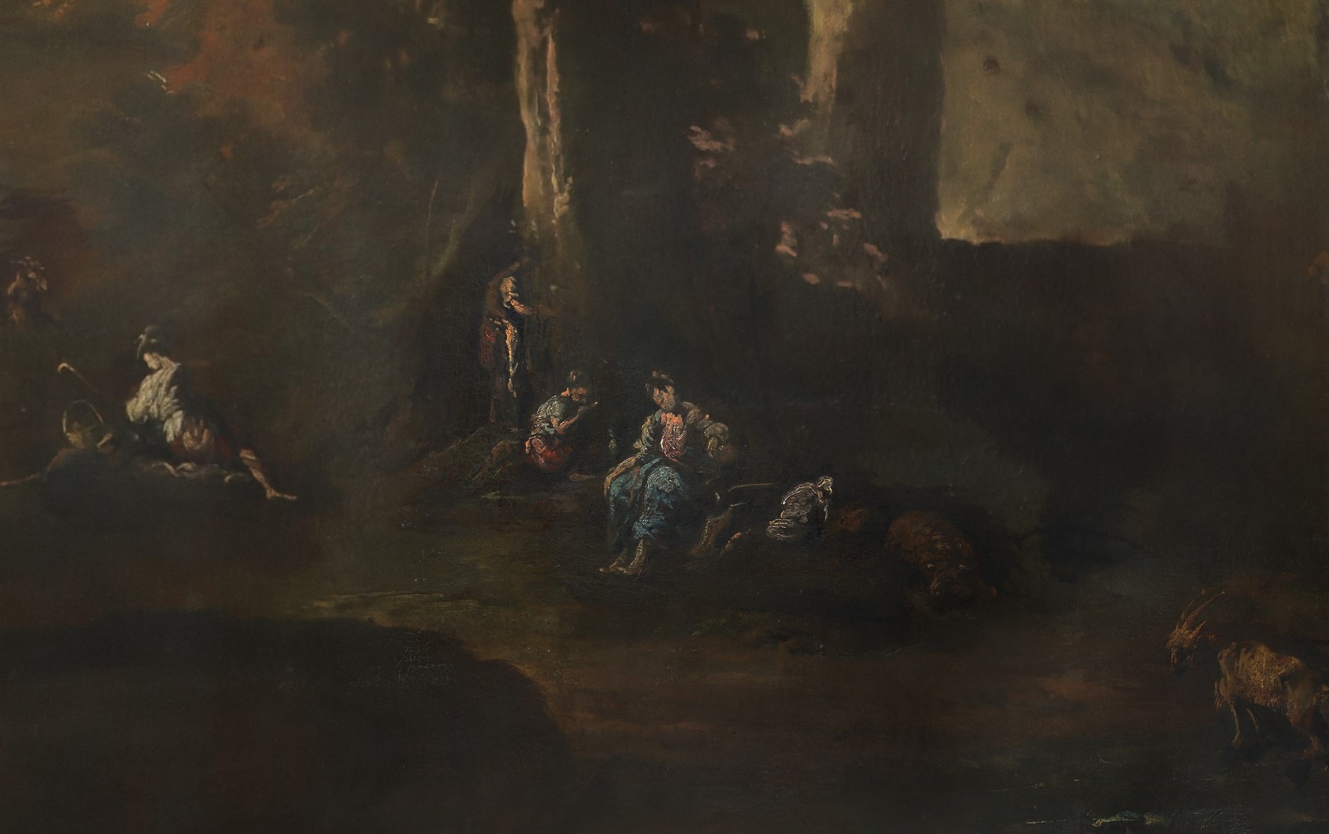 Alessandro Magnasco (Genova 1667-1749) - Paesaggio con personaggi H cm 178x158 - in cornice H cm 192x174 Il dipinto in esame è una preziosa testimonianza delle opere paesaggistiche di Alessandro Magnasco, detto il Lissandrino per la sua minuta statura.