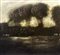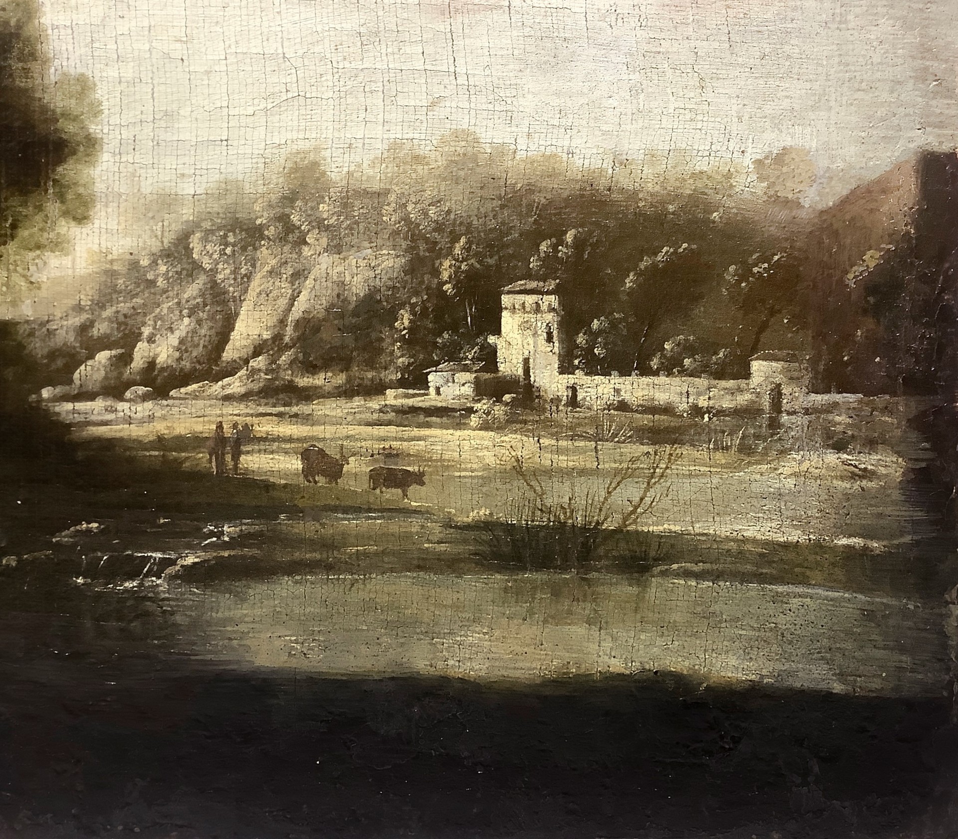 Paesaggio bucolico con casa sul lago, primi 19° secolo 50x75 cm Olio su tela Pittore italiano del inizi XIX Secolo. Piccolo foro. Antica collezione Notaio Cav. Fazio. Superficie del dipinto risulta interessata dalla presenza di uno strato di vernice ossidata e ingiallita