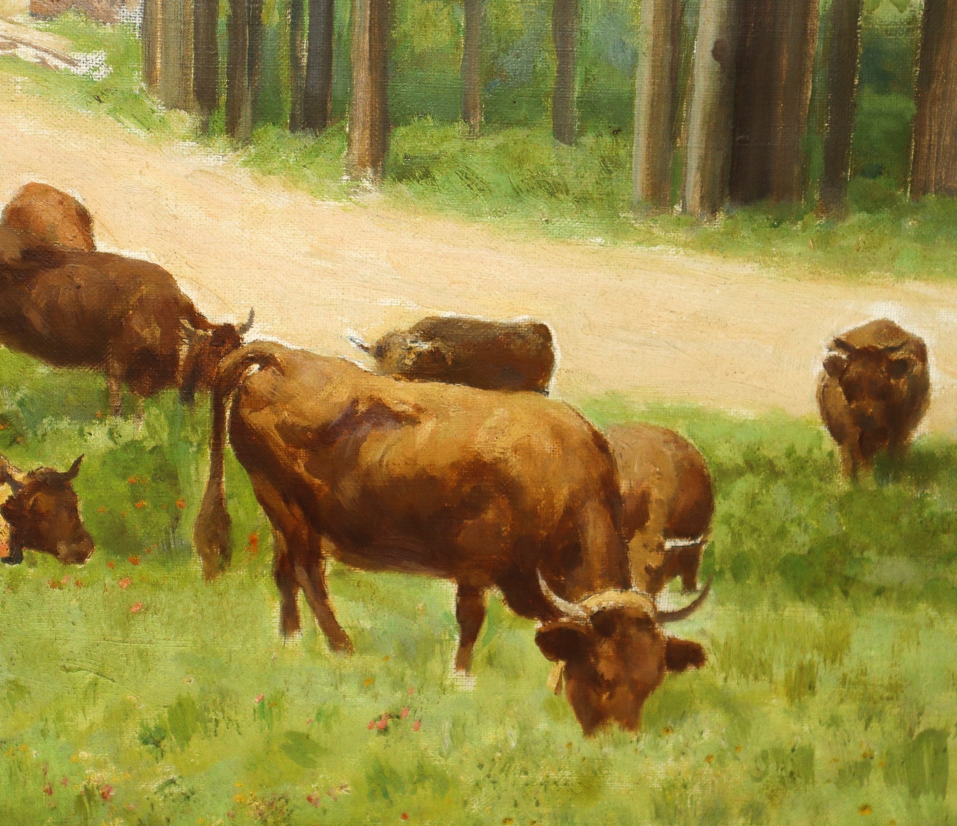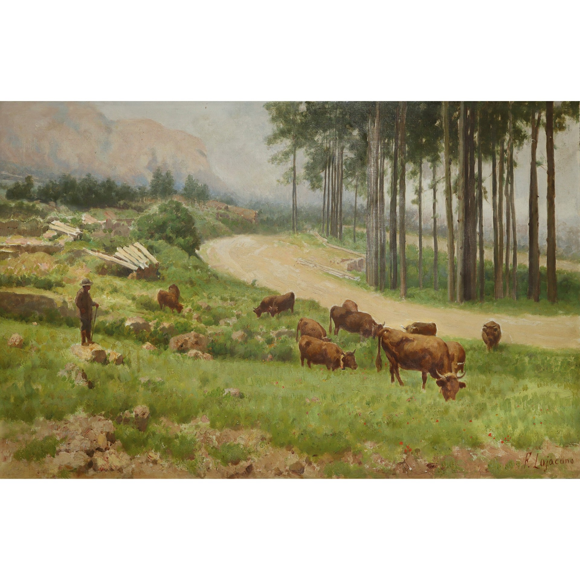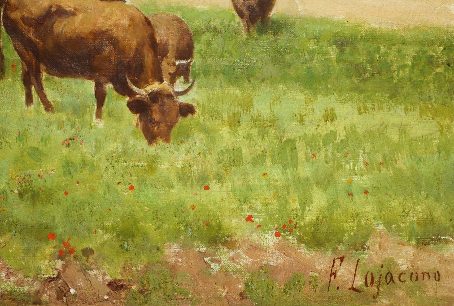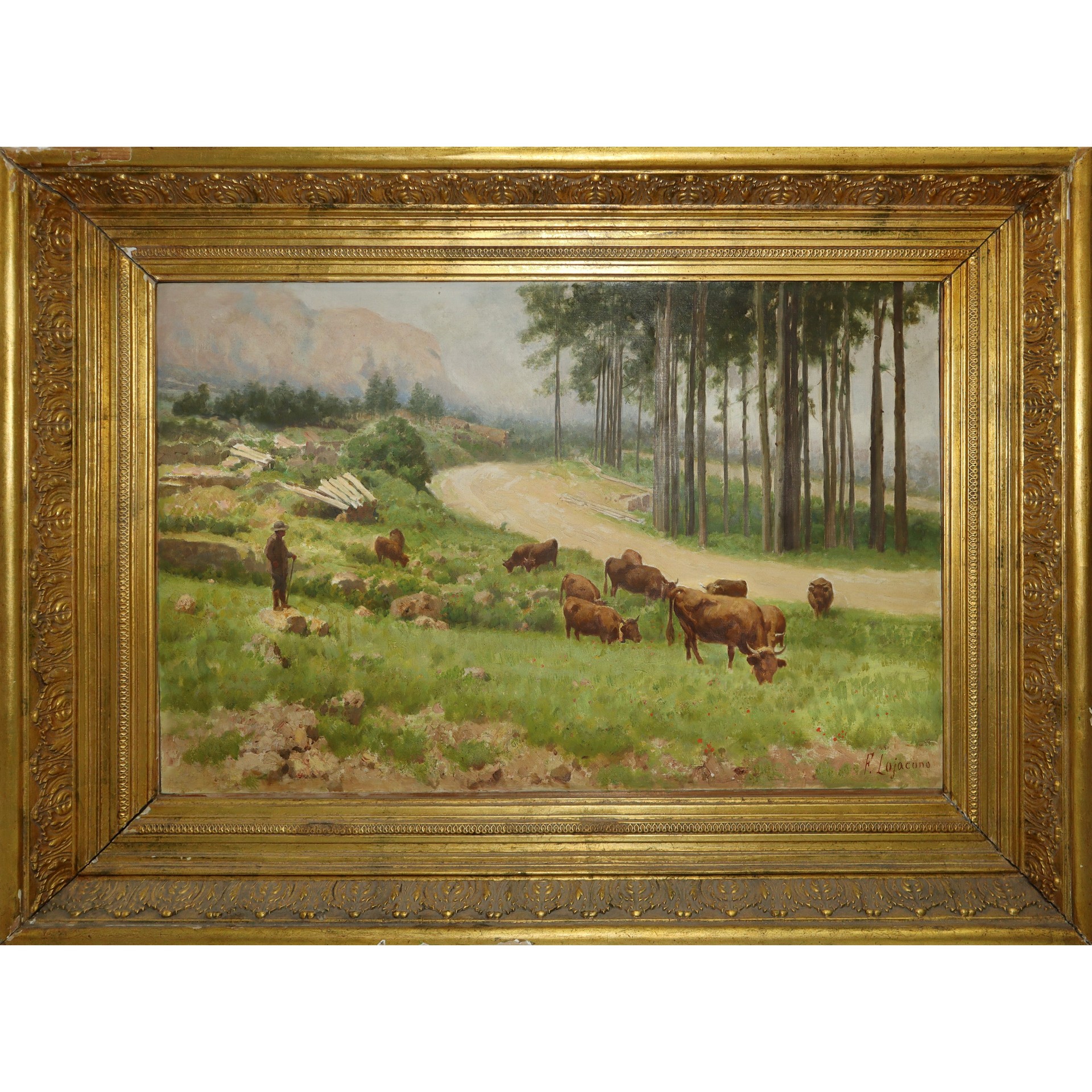 Francesco Lojacono (Palermo 1838-Palermo 1915) - Paesaggio campestre con alberi e armenti lungo una strada delle Madonie Cm 52 x 80 in cornice cm 79x107 Olio su tela Firmato in basso a destra, in prima tela. In cornice di legno dorato a pastiglia