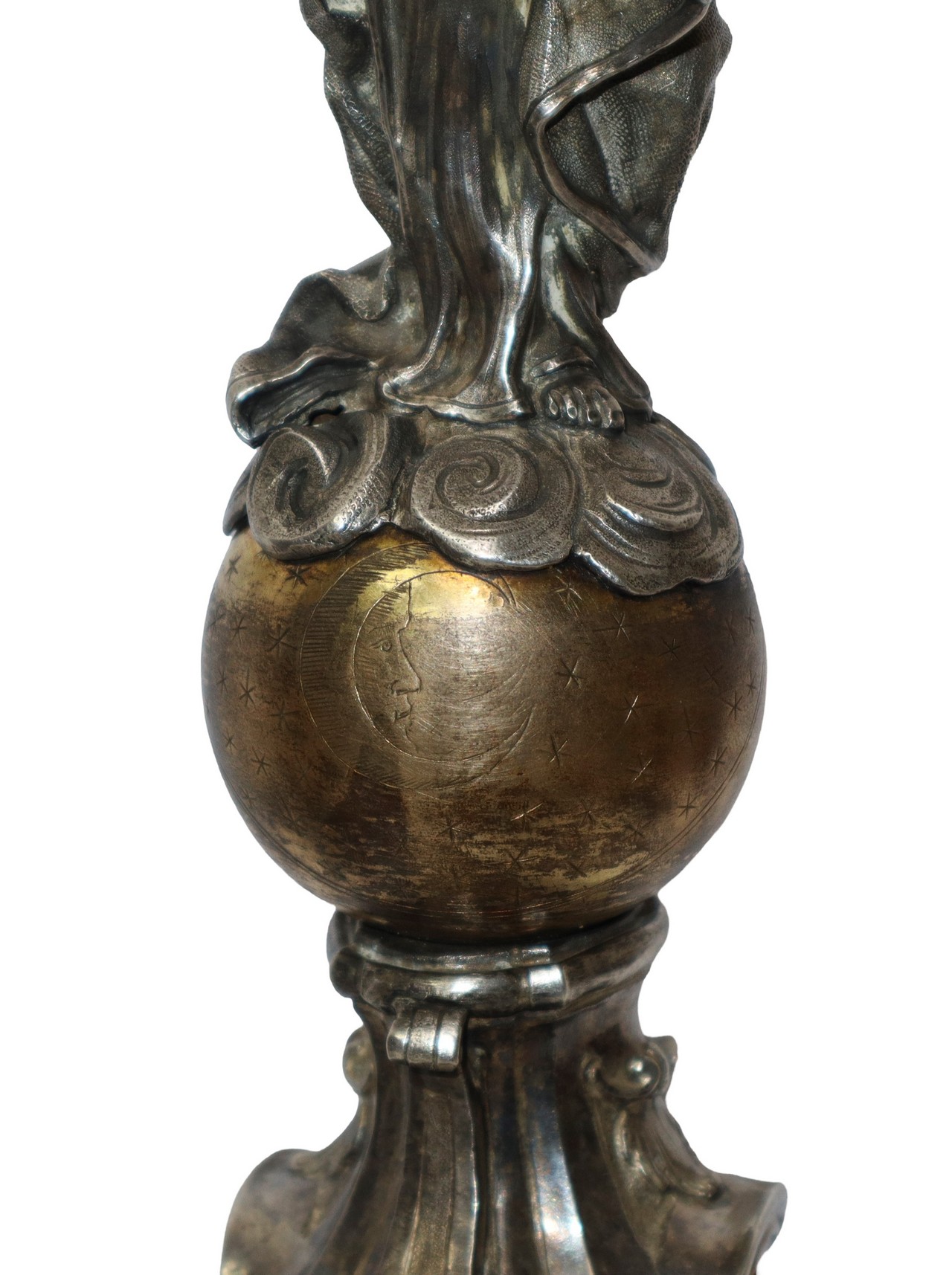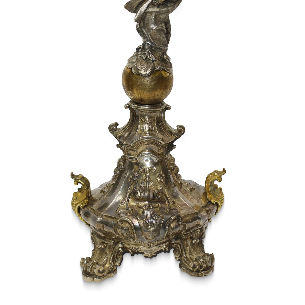Ostensorio in argento e argento vermeil con Allegoria della Fede di sostegno, 18° secolo gr. 2726 - H cm 74,5x20x15 Base con quattro piedi, sormontata da globo sotto immagine dell'Allegoria della Fede. Grande raggera con foglie e grappoli d'uva applicati. Italia MeridionaleBase con quattro piedi, sormontata da globo sotto immagine dell'Allegoria della Fede. Grande raggera con foglie e grappoli d'uva applicati. Italia Meridionale