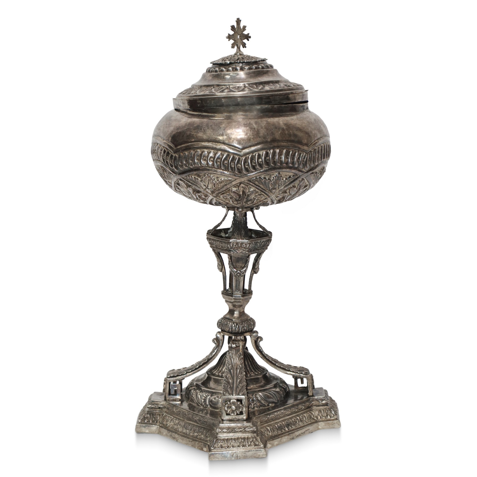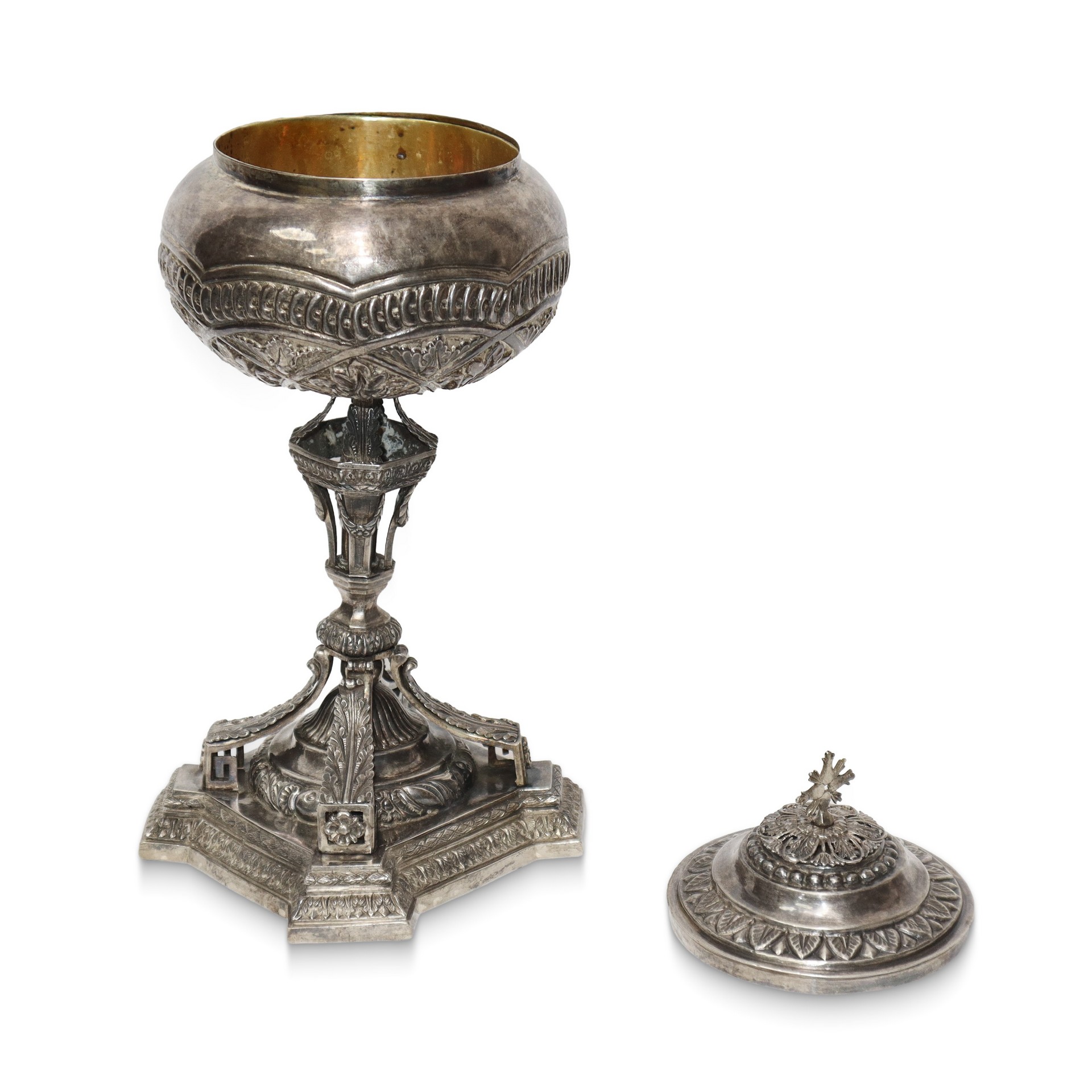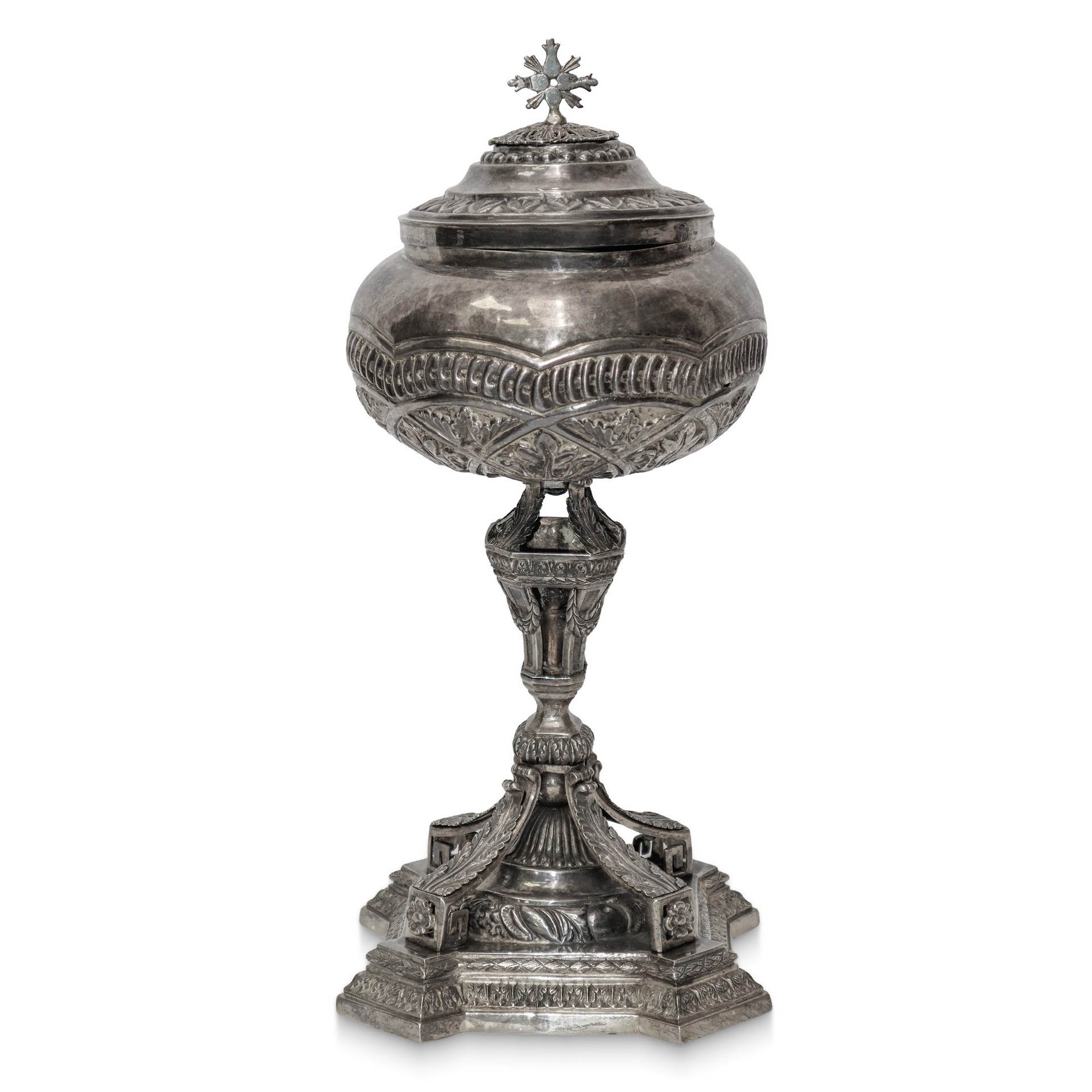 Pisside in argento Impero, primi 19° secolo gr. 972 - H cm 32x14 Sbalzata con applicazione di foglie d'acanto alla base. Regno delle Due Sicilie. Sbalzata con applicazione di foglie d'acanto alla base. Regno delle Due Sicilie.