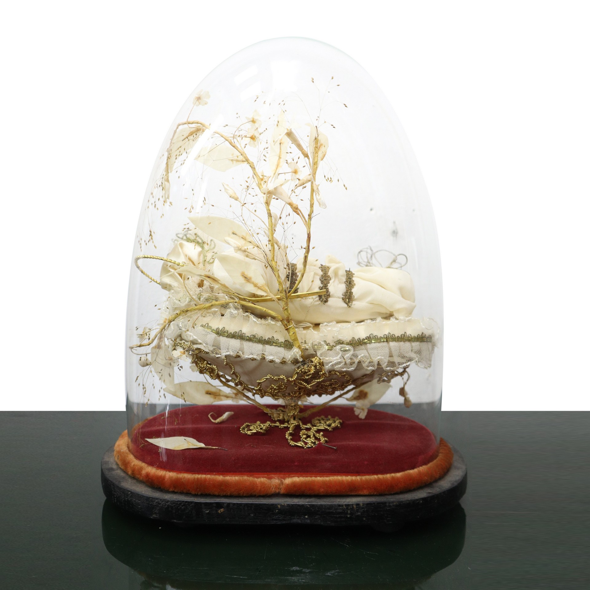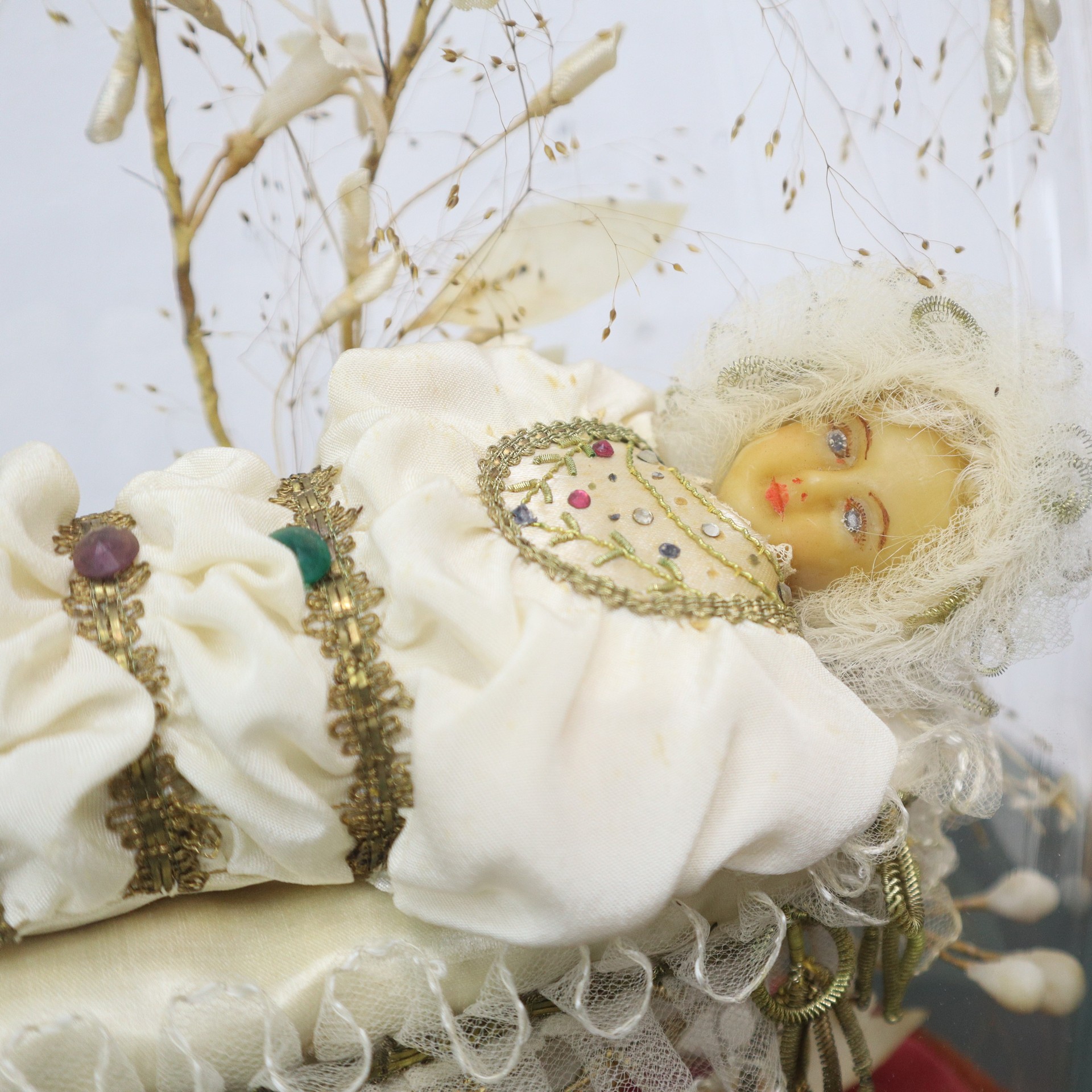 Madonna bambina in ceroplastica in teca di vetro, nineteen° secolo H cm 35 - base cm 28x17 Con addobbi floreali.Con addobbi floreali.